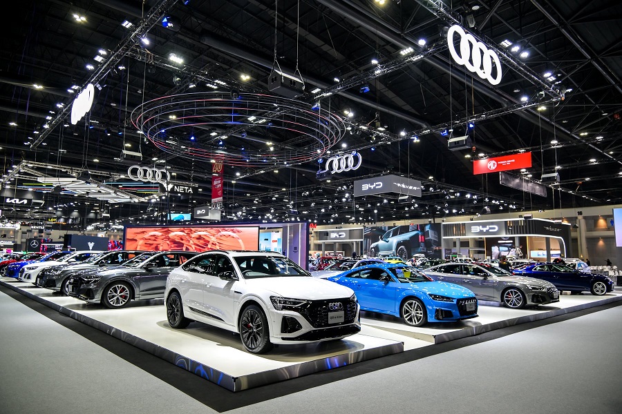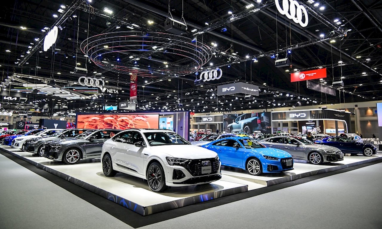 บูธ Audi ภายในงาน Motor Expo ครั้งที่ 40 อาวดี้จัดแสดงรถครอบคลุมหลากหลายเซกเมนต์ รถพลังงานไฟฟ้า 100% มีวางจำหน่าย 2 รุ่น
