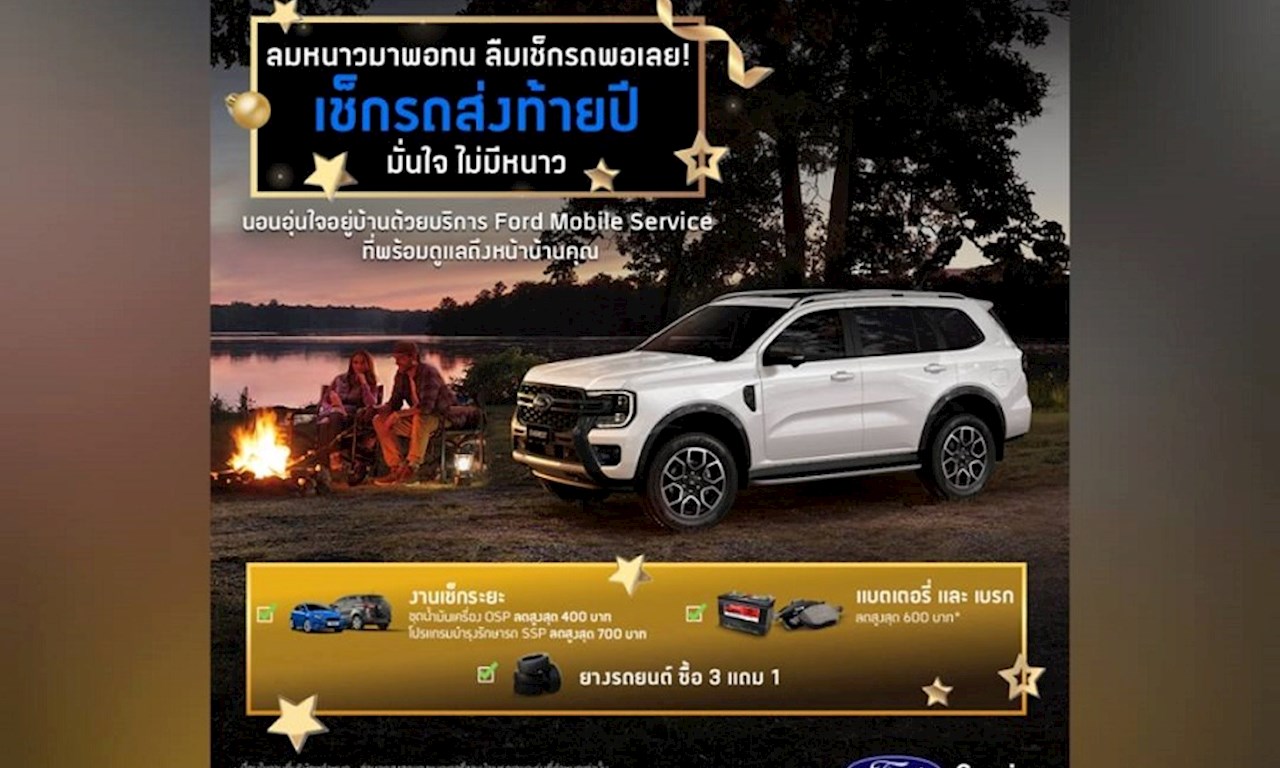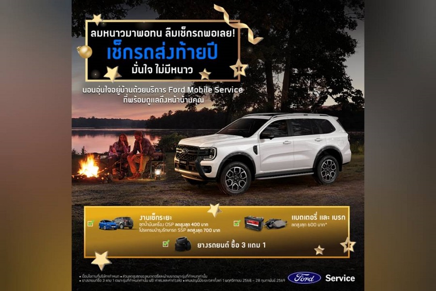 ฟอร์ด ประเทศไทย ส่งแคมเปญด้านบริการสุดคุ้มเพื่อเสริมความอุ่นใจในการดูแลรักษารถฟอร์ดให้พร้อมทุกการเดินทางในเทศกาลพิเศษช่วงฤดูหนาวปลายปี ประกอบด้วย ส่วนลดพิเศษชุดน้ำมันเครื่องลดสูงสุด 400 บาท ส่วนลดโปรแกรมบำรุงรักษาตามระยะสูงสุด 700 บาท หรือโปรโมชันซื้อยางรถยนต์ 3 เส้น แถมฟรี 1 เส้น ส่วนลดเมื่อเข้ารับบริการเปลี่ยนแบตเตอรี่หรือผ้าเบรก และบริการตรวจเช็คสภาพรถ 30 รายการฟรี ระหว่างวันที่ 1 พฤศจิกายน ถึง 28 กุมภาพันธ์ 2569 ที่ศูนย์บริการฟอร์ดทั่วประเทศ