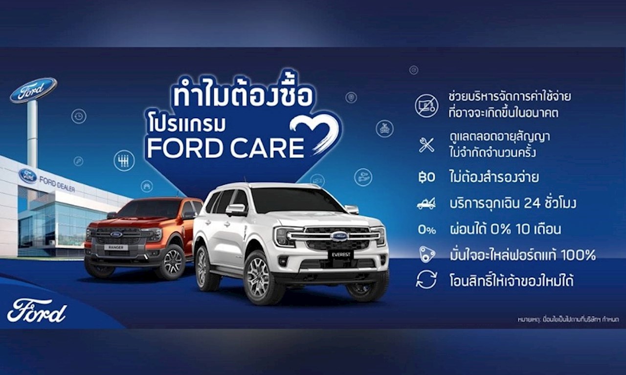 ฟอร์ด ประเทศไทย เดินหน้าเสริมแกร่งด้านบริการและความมั่นใจให้กับลูกค้า ด้วยการนำเสนอ ‘ฟอร์ดแคร์’ (FORD CARE) สำหรับรถยนต์ฟอร์ด เจเนอเรชันใหม่ ซึ่งเป็นโปรแกรมการขยายระยะการรับประกันคุณภาพรถยนต์ในรูปแบบสมาชิกที่มอบการดูแลและคุ้มครองรถของลูกค้าแบบครบวงจร เพื่อช่วยให้ลูกค้าคลายความกังวลเรื่องค่าใช้จ่ายในการบำรุงรักษา เพิ่มความสบายใจในการถือครองรถในระยะยาว โดยฟอร์ดแคร์สำหรับรถยนต์ฟอร์ดรุ่นใหม่ พร้อมให้จำหน่ายแล้วด้วย 2 แพ็กเกจหลัก คือ โกลด์ แพ็กเกจ (Gold Package) ให้ความคุ้มครองชิ้นส่วนอะไหล่ของตัวรถกว่า 1,000 รายการ และไดรฟไลน์ แพ็กเกจ (Driveline Package) เน้นความคุ้มครองในส่วนของเครื่องยนต์ และระบบส่งกำลัง โดยมีระยะคุ้มครองให้เลือกที่หลากหลายสูงสุดถึง 10 ปี หรือ 250,000 กิโลเมตร พร้อมบริการช่วยเหลือฉุกเฉินบนท้องถนนตลอด 24 ชั่วโมง สูงสุด 10 ปี