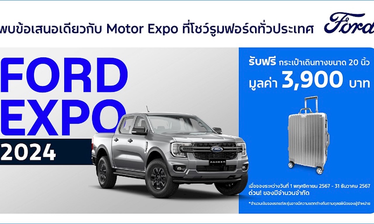 ฟอร์ด ประเทศไทย จัดแคมเปญสุดคุ้มส่งท้ายปี ‘ฟอร์ด เอ็กซ์โป’ มอบข้อเสนอเดียวกับงานมอเตอร์ เอ็กซ์โป สำหรับรถฟอร์ดหลากหลายรุ่นเพื่อให้ตอบโจทย์การใช้งานทุกรูปแบบด้วยข้อเสนอสุดเร้าใจมากมาย อาทิ ฟอร์ด เรนเจอร์ XLS รุ่นใหม่ล่าสุด ราคาพิเศษช่วงเปิดตัวเพียง 799,000 บาท ฟอร์ด เอเวอเรสต์ เทรนด์ ราคาพิเศษ 1,249,000 บาท ฟอร์ด เรนเจอร์ แร็พเตอร์ ดอกเบี้ย 0.99% พิเศษ! เมื่อลูกค้าจองรถฟอร์ดรุ่นใดก็ได้ ระหว่างวันที่ 1 พฤศจิกายน ถึง 31 ธันวาคม 2567 ที่โชว์รูมฟอร์ดทั่วประเทศ รับฟรี กระเป๋าเดินทางฟอร์ดดีไซน์หรู มูลค่า 3,900 บาท