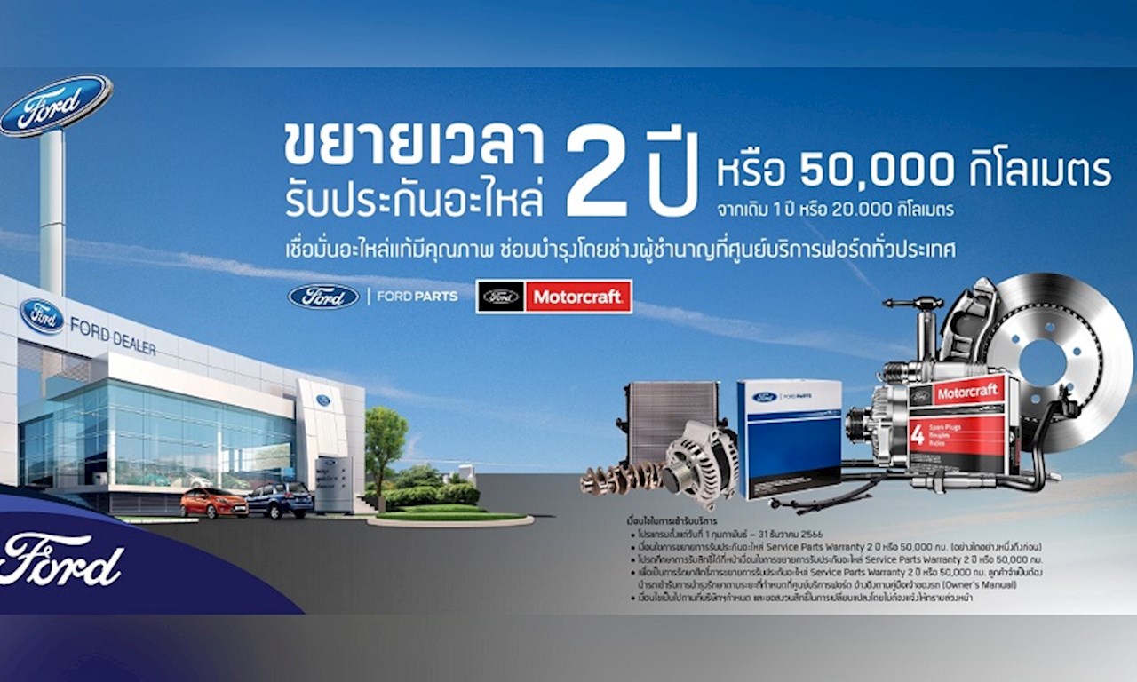 ฟอร์ด ประเทศไทย มอบสิทธิขยายการรับประกันอะไหล่ (Service Parts Warranty) สูงถึง 2 ปี หรือ 50,000 กิโลเมตร แล้วแต่ระยะใดจะถึงก่อน เพื่อเสริมความมั่นใจแก่เจ้าของรถยนต์ฟอร์ด ตอกย้ำความมุ่งมั่นในการดูแลลูกค้าเสมือนคนในครอบครัว ลูกค้าที่นำรถยนต์ฟอร์ดเข้ารับบริการเปลี่ยนอะไหล่แท้ฟอร์ด (Ford Genuine Parts) หรือฟอร์ดมอเตอร์คราฟท์ (Ford Motorcraft) จะได้รับสิทธิขยายการรับประกันอะไหล่ตั้งแต่วันนี้ ถึง 31 ธันวาคม 2566 ณ ศูนย์บริการฟอร์ดทั่วประเทศ