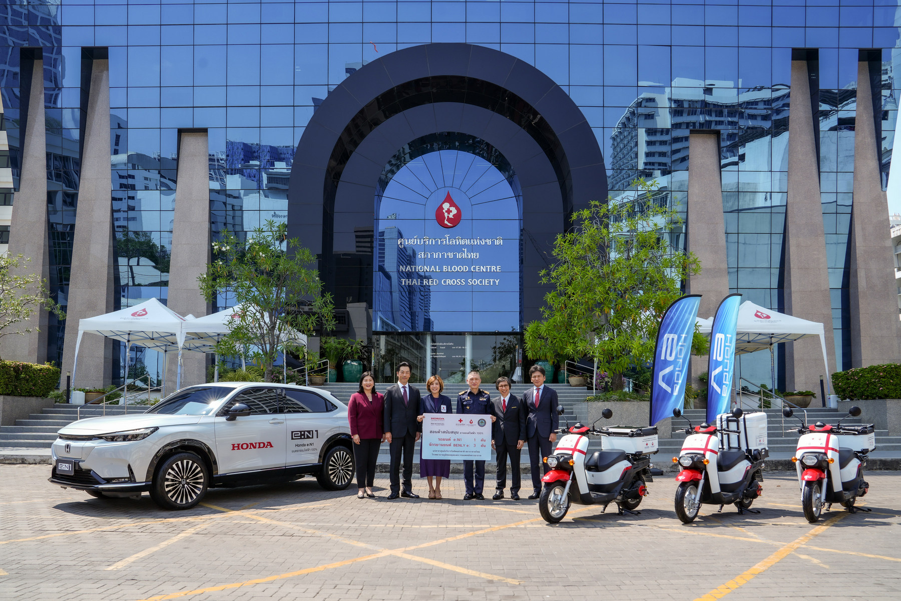 ฮอนด้าผนึกกำลังทั้งรถยนต์และรถจักรยานยนต์ นำโดย บริษัท ฮอนด้า ออโตโมบิล (ประเทศไทย) จำกัด และบริษัท ไทยฮอนด้า จำกัด ร่วมสนับสนุนยานยนต์ไฟฟ้า 100% ทั้ง Honda e:N1 รถยนต์เอสยูวีพลังงานไฟฟ้า จำนวน 1 คัน พร้อมเครื่องชาร์จรถยนต์ไฟฟ้า 1 เครื่อง และ รถจักรยานยนต์ไฟฟ้า Honda BENLY e: จำนวน 3 คัน ให้แก่ สภากาชาดไทย ณ ศูนย์บริการโลหิตแห่งชาติ สภากาชาดไทย เพื่อใช้ในกิจกรรมทางการแพทย์ อาทิ รับ-ส่งเลือดจากสำนักงานสภากาชาดไทยและโรงพยาบาลในกรณีฉุกเฉิน ขนส่งเลือดและยาไปยังโรงพยาบาลและคลินิกเครือข่าย รับเลือดจากหน่วยรับบริจาคเพื่อการดำเนินการรักษาในเบื้องต้นหรือในกรณีฉุกเฉิน ขนส่งบุคลากรทางการแพทย์ อุปกรณ์การแพทย์ และการให้บริการรับบริจาคโลหิตในหน่วยย่อยและในโรงพยาบาล เป็นต้น