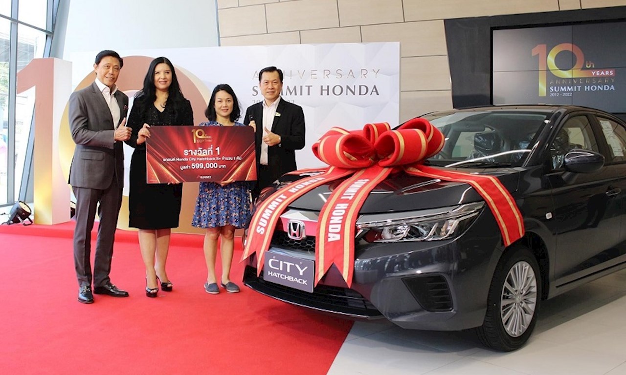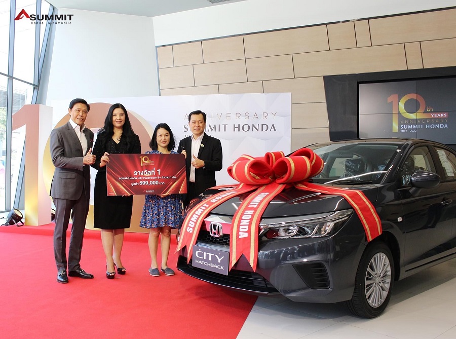 บริษัท ซัมมิท ฮอนด้า ออโตโมบิล จำกัด ผู้จำหน่ายรถยนต์ ฮอนด้า อย่างเป็นทางการในประเทศไทย ฉลองครบรอบปีที่ 10 มอบรางวัลใหญ่ รถยนต์ ‘ฮอนด้า ซิตี้ แฮทช์แบค เอสพลัส’ ให้กับคุณรมณ อนุพันธ์ ผู้โชคดีในแคมเปญฉลองครบรอบ 10 ปี ซัมมิท ฮอนด้า โดยงานนี้ได้รับเกียรติจากคุณธีรวรรณ จิวจินดา ผู้จัดการทั่วไป ฝ่ายขายและการตลาด และคุณวิวัฒน์ กิจเครือ ผู้จัดการทั่วไป ฝ่ายบริการหลังการขาย บริษัท ซัมมิท ฮอนด้า ออโตโมบิล จำกัด ให้เกียรติเป็นผู้มอบรางวัล ณ โชว์รูม ซัมมิท ฮอนด้า สาขาบางนา กม. 4.5
