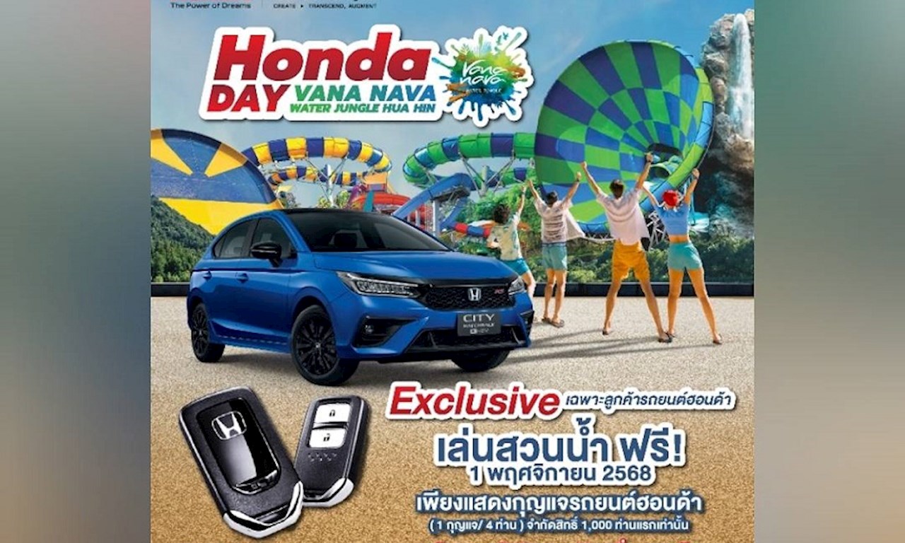 ครอบครัวฮอนด้า เตรียมตัวให้พร้อม! กับกิจกรรม Honda Day 2025 มอบสิทธิพิเศษ เข้าสวนน้ำ วานา นาวา หัวหิน (Vana Nava Hua Hin) ฟรี ! ในวันเสาร์ที่ 1 พฤศจิกายน 2568 เพียงโชว์กุญแจรถยนต์ฮอนด้ารุ่นใดก็ได้ ที่จุดจำหน่ายบัตรหน้าสวนน้ำ 1 กุญแจ สนุกได้ทั้งครอบครัวสูงสุด 4 ท่าน พร้อมรับฟรี ! คูปองแลกของที่ระลึก และสนุกกับกิจกรรมสุดพิเศษอีกมากมายที่บูทฮอนด้าในงาน จำกัดสิทธิ์เพียง 250 สิทธิ์ หรือ 1,000 ท่าน เท่านั้น !