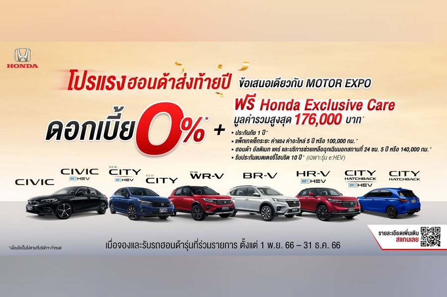 บริษัท ฮอนด้า ออโตโมบิล (ประเทศไทย) จำกัด จัดโปรโมชันพิเศษต้อนรับเทศกาลส่งความสุขส่งท้ายปี เพื่อให้ลูกค้าเป็นเจ้าของรถยนต์ฮอนด้าได้ง่ายขึ้น กับแคมเปญสุดพิเศษ “โปรแรงฮอนด้าส่งท้ายปี ข้อเสนอเดียวกับ Motor Expo” ด้วยข้อเสนอพิเศษที่แตกต่างกันไปในแต่ละรุ่น ได้แก่ ดอกเบี้ยเริ่มต้น 0% หรือฮอนด้าช่วยผ่อน นาน 12 เดือน รวมมูลค่าสูงสุดถึง 54,000 บาท พร้อมรับ ฮอนด้า เอ็กซ์คลูซีฟ แคร์ (Honda Exclusive Care) ประกอบด้วย ฟรีประกันภัย 1 ปี พร้อมแพ็กเกจเช็กระยะ ค่าแรง ค่าอะไหล่ 5 ปี หรือ 100,000 กม. และฟรี Honda Ultimate Care (ฮอนด้า อัลติเมท แคร์) โปรแกรมการให้บริการพิเศษด้านคุณภาพรถยนต์ ขยายการรับประกันคุณภาพรถยนต์ใหม่และบริการช่วยเหลือฉุกเฉินบนท้องถนน 24 ชั่วโมง เพิ่มอีก 2 ปี หรือ 40,000 กิโลเมตร ต่อจากการรับประกันคุณภาพรถใหม่ 3 ปี หรือ 100,000 กิโลเมตร รวมเป็น 5 ปี หรือ 140,000 กิโลเมตร (อย่างใดอย่างหนึ่งถึงก่อน) พิเศษ สำหรับไลน์อัป อี:เอชอีวี รวมการรับประกันอายุการใช้งานแบตเตอรี่ไฮบริดถึง 10 ปี และรับประกันระบบไฮบริดทั้งระบบ 5 ปี ไม่จำกัดระยะทาง หรือทางเลือกพิเศษ Double Smile Plus สินเชื่อใหม่จาก ฮอนด้า ลีสซิ่ง ที่จะช่วยให้การออกรถยนต์ฮอนด้าคันใหม่ของคุณเป็นเรื่องง่ายๆ สบาย ๆ ดาวน์เริ่มต้นเพียง 5% พร้อมฟรีประกันภัย 1 ปี เฉพาะรุ่นที่ร่วมรายการ สำหรับลูกค้าที่จองและรับรถยนต์ฮอนด้ารุ่นที่ร่วมรายการตั้งแต่วันที่ 1 พฤศจิกายน 2566 – 31 ธันวาคม 2566