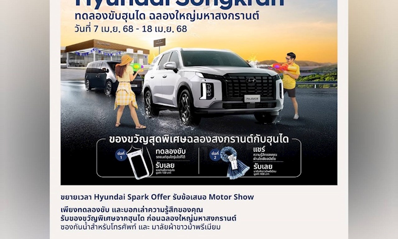 ฮุนได โมบิลิตี้ ประเทศไทย ชวนคุณมาฉลองสงกรานต์สุดคูลแบบไม่ซ้ำใคร กับกิจกรรม “Hyundai ฉลองใหญ่มหาสงกรานต์” ตั้งแต่วันที่ 7 – 18 เมษายน 2568 ที่ IONIQ Lab, H-Studio และ โชว์รูมฮุนไดทั่วประเทศ เพียงทดลองขับรถยนต์ฮุนไดรุ่นใดก็ได้ แล้วแชร์ประสบการณ์ดี ๆ ผ่านโซเชียลมีเดียของคุณพร้อมติดแฮชแท็ก #HyundaiSongkran #HyundaiSparkOffer รับฟรี! ของขวัญสุดเอ็กคลูซีฟจากฮุนได ทั้งซองกันน้ำดีไซน์ลิมิเต็ดอิดิชันหรือมาลัยผ้าขาวม้าให้คุณเฉลิมฉลองเทศกาลสงกรานต์อย่างมีสไตล์ ด้วยไอเท็มสุดคูลสำหรับคุณและคนในครอบครัวจากฮุนได