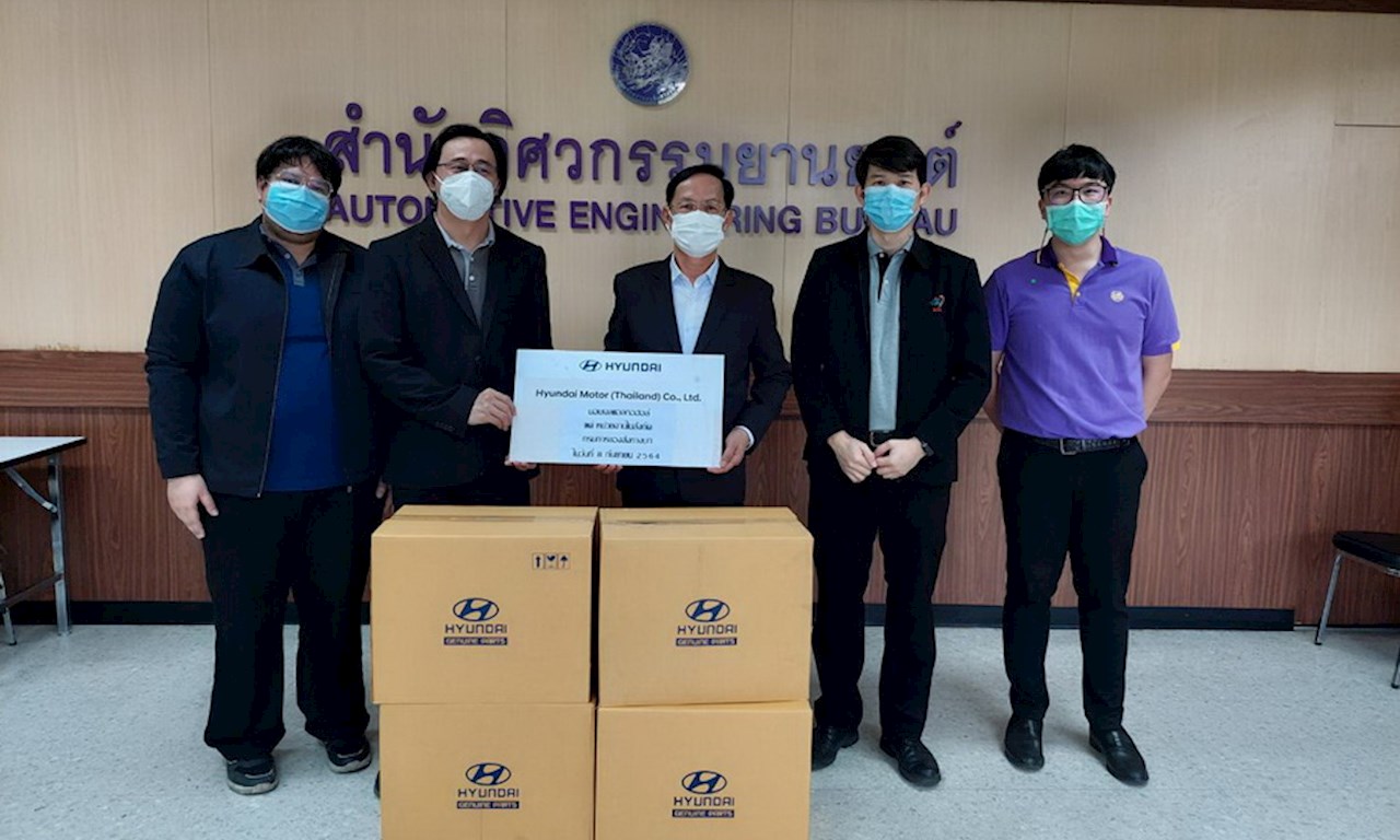 บริษัท ฮุนได มอเตอร์ (ไทยแลนด์) จำกัด นำทีมโดย คุณสิทธิพงศ์ คูภัทรโชติ ผู้จัดการทั่วไปฝ่ายวิศวกรรม ได้นำอุปกรณ์เพื่อช่วยป้องกันการแพร่ระบาดของโรคโควิด 19 ส่งมอบให้กับสำนักวิศวกรรมยานยนต์ กรมการขนส่งทางบกและสถาบันยานยนต์ ในครั้งนี้เป็นการให้ความช่วยอย่างต่อเนื่องของบริษัท ฯ ภายใต้นโยบายความรับผิดชอบต่อสังคมและเพื่อส่งเสริมให้ทุกคนปลอดภัยจากสถานการณ์การแพร่ระบาดของโรคโควิด 19 ในครั้งนี้