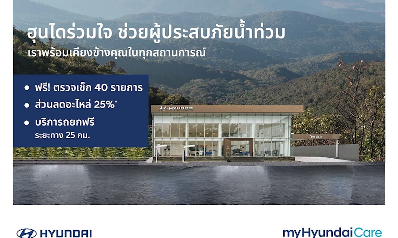 ท่ามกลางสถานการณ์อุทกภัยที่ยังส่งผลกระทบต่อหลายจังหวัดในภาคใต้ ทำให้ประชาชนจำนวนมาก โดยเฉพาะผู้ใช้รถยนต์ ต้องเผชิญความเสียหายจากน้ำท่วมอย่างไม่ทันตั้งตัว บริษัท ฮุนได โมบิลิตี้ (ประเทศไทย) จำกัด ขอร่วมบรรเทาความเดือดร้อนของลูกค้าผ่านมาตรการช่วยเหลือเร่งด่วนสำหรับรถยนต์ที่ได้รับผลกระทบ ด้วยบริการตรวจเช็กสภาพรถฟรี 40 รายการ และส่วนลดค่าอะไหล่แท้ฮุนได 25% สำหรับงานซ่อมมูลค่า 50,000 บาทขึ้นไป (ไม่รวมผลิตภัณฑ์หล่อลื่นและของเหลวทุกชนิด) เพื่อลดภาระค่าใช้จ่ายและช่วยให้รถของท่านกลับมาพร้อมใช้งานได้อย่างมั่นใจ โดยทีมช่างผู้เชี่ยวชาญจะตรวจประเมินความเสียหายอย่างละเอียดตามมาตรฐานศูนย์บริการ