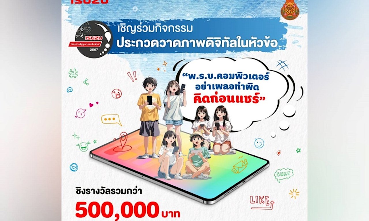 อีซูซุร่วมกับสำนักงานคณะกรรมการการศึกษาขั้นพื้นฐาน (สพฐ.) เดินหน้าจุดประกายความคิดสร้างสรรค์ทางด้านศิลป์กับเยาวชนคนรุ่นใหม่ และสร้างความตระหนักรู้เกี่ยวกับ พ.ร.บ.ว่าด้วยการกระทำความผิดเกี่ยวกับคอมพิวเตอร์ ผ่านการจัดประกวดวาดภาพรูปแบบดิจิทัลในโครงการ “อีซูซุเยาวชนสัมพันธ์” ประจำปี 2567 โดยเชิญชวนนักเรียนระดับมัธยมศึกษาสายสามัญทั่วประเทศ ร่วมส่งผลงานรูปแบบดิจิทัลสุดสร้างสรรค์ในรอบคัดเลือก ภายใต้หัวข้อ “พ.ร.บ.คอมพิวเตอร์ อย่าเผลอทำผิด คิดก่อนแชร์” ผ่านเว็บไซต์ www.isuzuyouthrelations.com ตั้งแต่วันนี้ – 31 มกราคม 2568 ชิงรางวัลทุนการศึกษาพร้อมโล่ประกาศเกียรติคุณ มูลค่ารวมกว่า 500,000 บาท