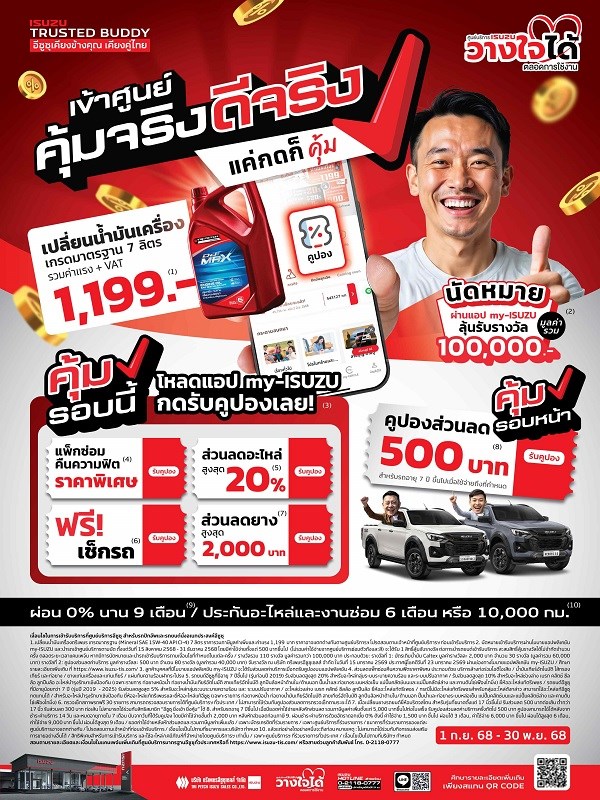สามารถรับสิทธิ์ทั้งหมดนี้ง่าย ๆ เพียงกดรับคูปองผ่านแอปพลิเคชัน my-ISUZU นอกจากนี้สำหรับลูกค้าที่นัดหมายและเข้ารับบริการในช่วงวันที่ 15 สิงหาคม 2568 - 31 ธันวาคม 2568 ผ่านแอปพลิเคชัน my-ISUZU มีสิทธิ์ลุ้นรับรางวัลรวม 110 รางวัล มูลค่ารวม 100,000 บาท