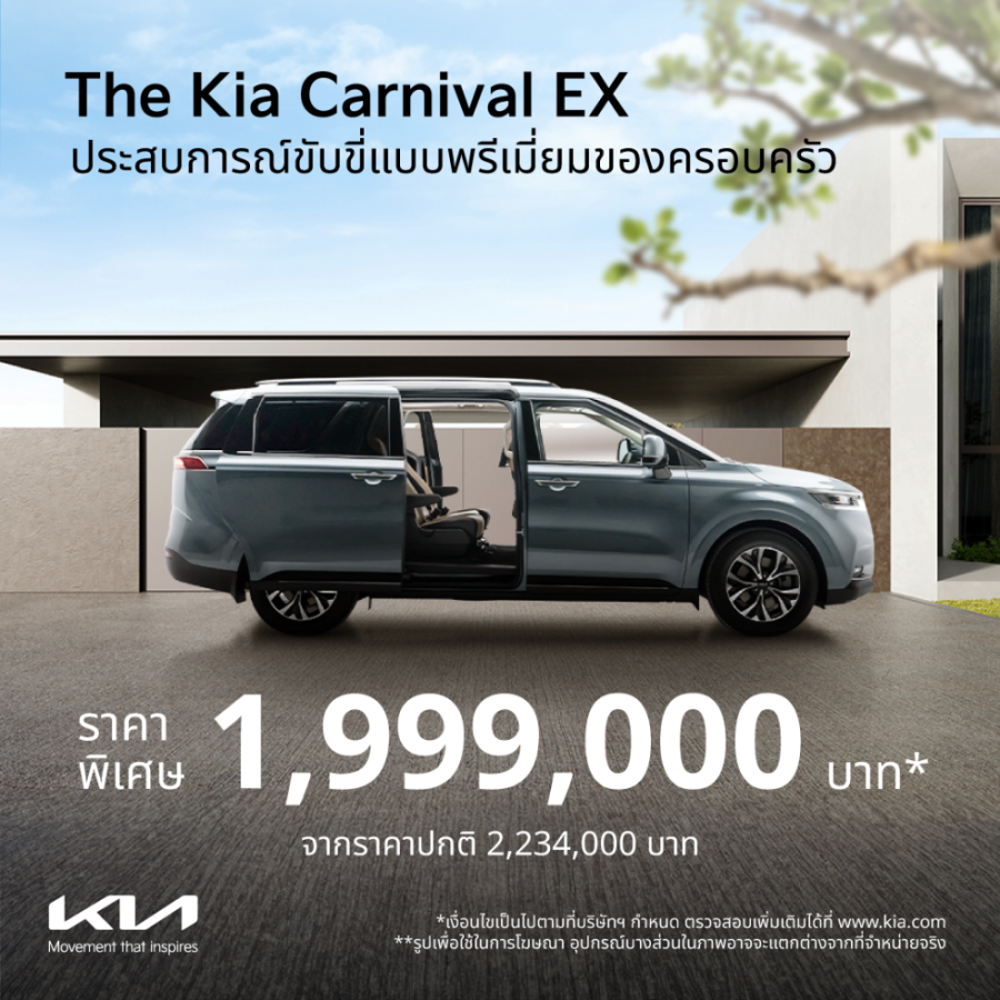 และโปรโมชันสำหรับรถครอบครัวยอดนิยมอย่าง The Kia Carnival ที่เกีย เซลส์ (ประเทศไทย) มอบข้อเสนอราคาพิเศษให้กับทุกรุ่นย่อย ไม่ว่าจะเป็นรุ่น 11 ที่นั่งอย่าง The Kia Carnival EX กับราคาพิเศษ 1,999,000 บาท (ราคาจำหน่ายปกติ 2,234,000 บาท) The Kia Carnival LX ราคาพิเศษ 1,599,000 บาท (ราคาจำหน่ายปกติ 1,892,000 บาท) The Kia Carnival SXL ราคาพิเศษ 2,349,000 บาท (ราคาจำหน่ายปกติ 2,594,000 บาท) และรุ่น 7 ที่นั่งอย่าง The Kia Carnival SXL Luxury ราคาพิเศษ 2,699,000 บาท (ราคาจำหน่ายปกติ 2,990,000 บาท) โดยทุกรุ่นมาพร้อมการรับประกันคุณภาพนาน 5 ปี และบริการช่วยเหลือฉุกเฉิน ฟรี 24 ชั่วโมง นาน 5 ปี ไม่จำกัดระยะทาง