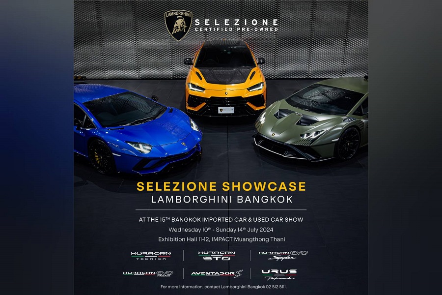 บริษัท เรนาสโซ มอเตอร์ จำกัด ตัวแทนจำหน่ายรถยนต์ลัมโบร์กินีอย่างเป็นทางการรายเดียวในประเทศไทย นำโดย อภิชาติ ลีนุตพงษ์ ประธานกรรมการ, ศักดิ์ นานา และ ม.ล.พลอยนภัส ลีนุตพงษ์ กรรมการ ยกทัพ Selezione Certified Pre-owned จัดแสดงในงาน Bangkok Imported Car & Used Car Show ครั้งที่ 15 พร้อมเผยโฉมลัมโบร์กินี Pre-owned ที่ได้รับการรับรองคุณภาพจากทางลัมโบร์กินีและมาตรฐานสูงสุดจากเรนาสโซ มั่นใจด้วยการตรวจสอบประวัติรถได้ทุกคัน มาพร้อมข้อเสนอสุดพิเศษเฉพาะในงาน อาทิ Huracán Tecnica, Huracán STO, Huracán EVO RWD, Aventador S, Huracán EVO Spyder และ Urus Performante ระหว่างวันที่ 10-14 กรกฎาคม 2567 ณ อิมแพ็ค อารีนา เมืองทองธานี, Exhibition Hall 11-12