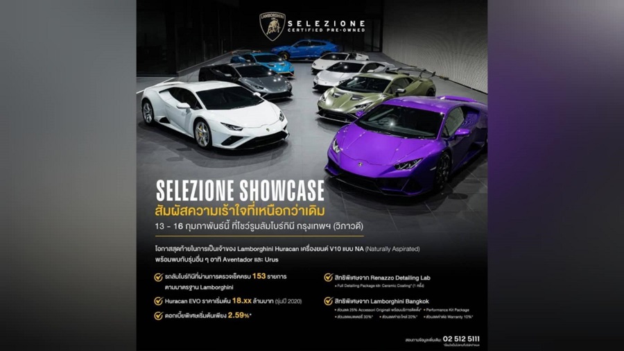 บริษัท เรนาสโซ มอเตอร์ จำกัด ตัวแทนจำหน่ายรถยนต์ลัมโบร์กินีอย่างเป็นทางการรายเดียวในประเทศไทย นำโดย อภิชาติ ลีนุตพงษ์ ประธานกรรมการ, ศักดิ์ นานา และ ม.ล.พลอยนภัส ลีนุตพงษ์ กรรมการ ยกทัพ Lamborghini Selezione Certified Pre-owned กว่า 30 คัน เผยโฉมลัมโบร์กินี Pre-owned ที่ผ่านการตรวจเช็คประวัติรถและ 153 รายการ ตามมาตรฐานโรงงาน Lamborghini และพร้อมส่งมอบทันที ซึ่งเป็นโอกาสทองที่ผู้ซื้อและผู้ขายจะได้พบกันโดยตรง มาพร้อมกับข้อเสนอสุดพิเศษเฉพาะในงาน ที่เรียกได้ว่าเป็นดีลที่คุ้มที่สุดและดีที่สุดแห่งปี
