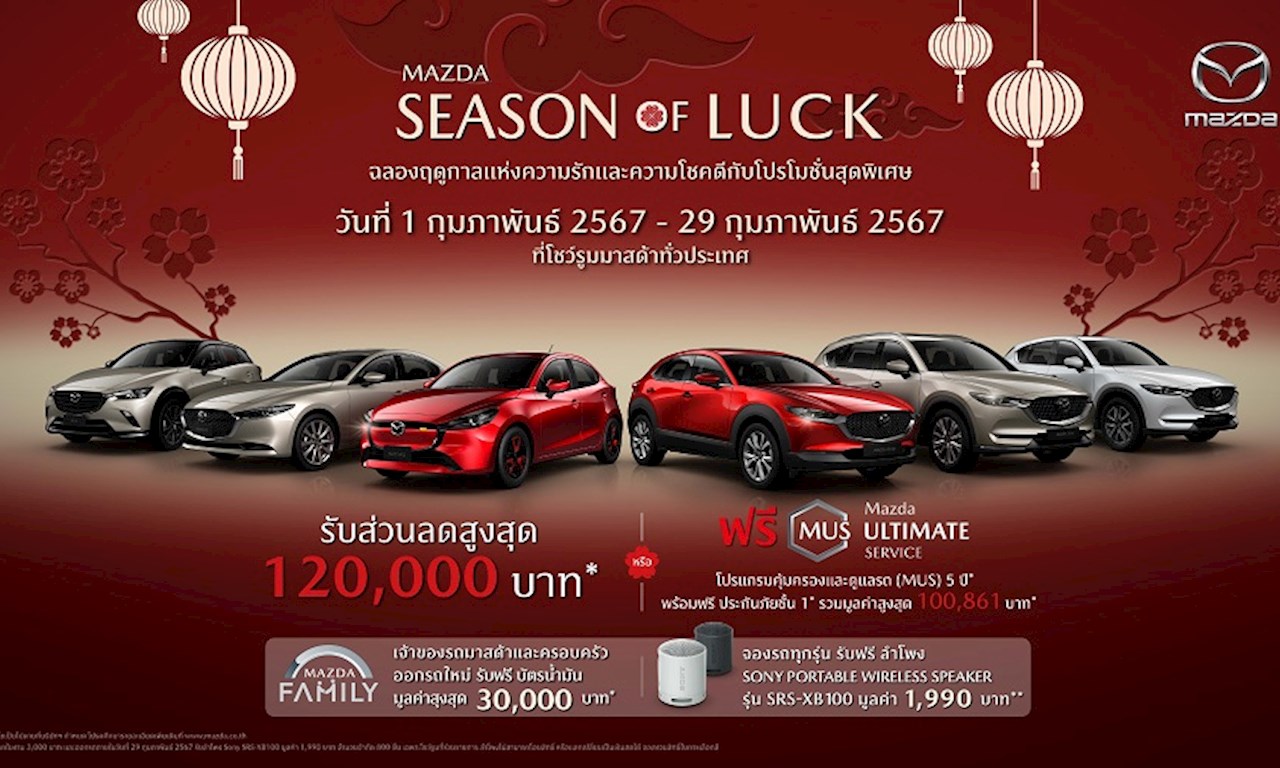 มาสด้าเดินหน้ากระตุ้นตลาดแบบเต็มสูบโอกาสทองของลูกค้ามาถึงแล้ว ครั้งแรกและครั้งเดียวในรอบปีกับรถยนต์มาสด้าทุกรุ่นในราคาสุดพิเศษ สำหรับลูกค้าที่ต้องการเป็นเจ้าของรถยนต์นั่งสปอร์ตระดับพรีเมี่ยมที่สง่างามที่สุดในโลก เจ้าของรางวัลรถยนต์ออกแบบยอดเยี่ยมของโลก World Car Design of The Year อัดแน่นไปด้วยเทคโนโลยีสกายแอคทีฟ และระบบความปลอดภัยระดับโลก เมื่อมาสด้าร่วมฉลองฤดูกาลแห่งความรักและความโชคดีกับโปรโมชั่นพิเศษสุดครั้งเดียวในรอบปี SEASON OF LUCK มอบสิทธิพิเศษสำหรับลูกค้าที่ต้องการซื้อรถยนต์มาสด้าตลอดเดือนกุมภาพันธ์ รับส่วนลดสูงสุด 120,000 บาท หรือ โปรแกรมคุ้มครองและดูแลรถ 5 ปี (MUS) พร้อมฟรีประกันภัยชั้น 1 รวมมูลค่าสูงสุด 100,861 บาท และเมื่อจองซื้อรถยนต์มาสด้าทุกรุ่น รับฟรีลำโพง Sony Portable Wireless Speaker มูลค่า 1,990 บาท พร้อมมอบสิทธิพิเศษให้กับเจ้าของรถยนต์มาสด้าและครอบครัวที่ออกรถใหม่ รับเพิ่มฟรีบัตรน้ำมันมูลค่าสูงสุด 30,000 บาท ลูกค้าที่สนใจพบข้อเสนอพิเศษนี้ได้ระหว่างวันที่ 1-29 กุมภาพันธ์ 2567 ที่โชว์รูมมาสด้าทั่วประเทศ