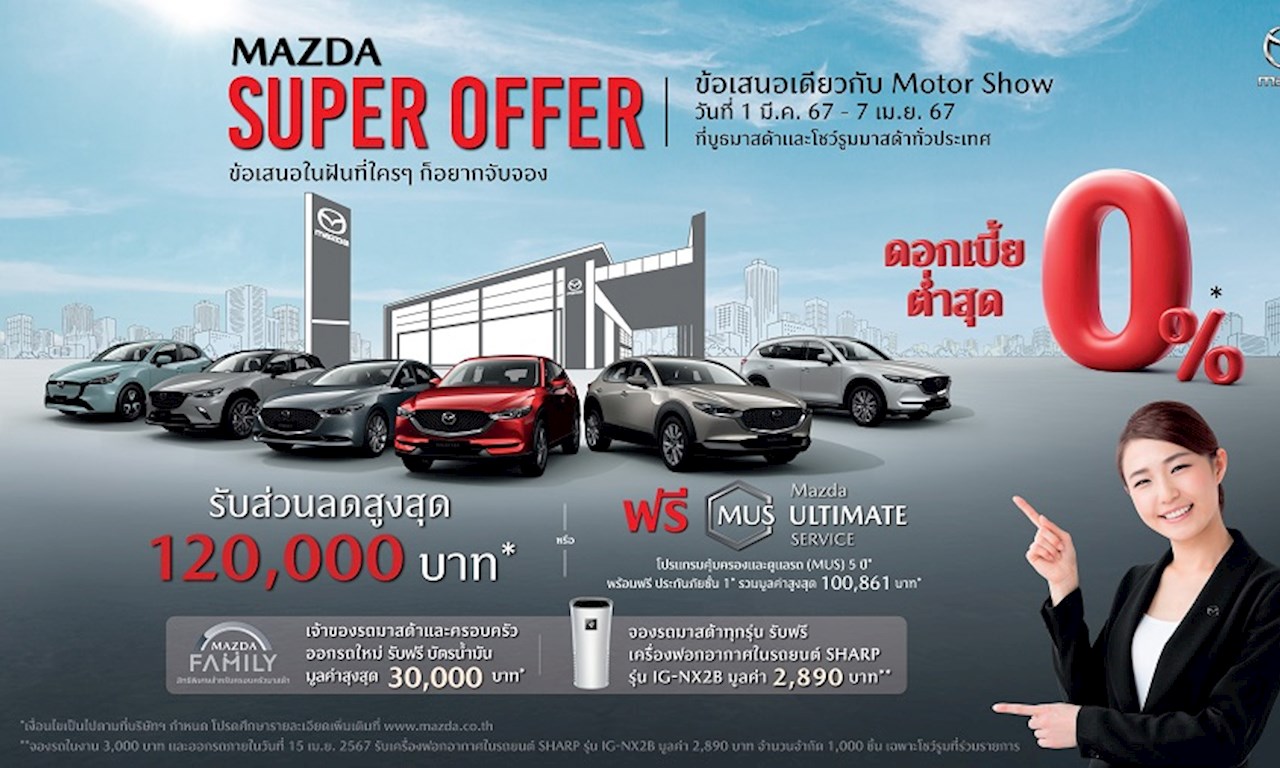 ตีเหล็กต้องตีตอนร้อน หลังประสบความสำเร็จอย่างสูงจากแคมเปญ Mazda Season of Luck เมื่อเดือนกุมภาพันธ์ที่ผ่านมา มาสด้าไม่รอช้าอัดข้อเสนอสุดร้อนแรงต่อเนื่องรับเดือนมีนาคม กับแคมเปญ Mazda Super Offer ข้อเสนอในฝันที่ใคร ๆ ก็อยากจับจอง ซึ่งเป็นข้อเสนอเดียวกับงานมอเตอร์โชว์ รับดอกเบี้ยต่ำสุด 0% ส่วนลดสูงสุด 120,000 บาท ฟรีโปรแกรมคุ้มครองและดูแลรถ Mazda Ultimate Service (MUS) 5 ปี ฟรีประกันภัยชั้น 1 Mazda Premium Insurance รวมมูลค่าสูงสุด 100,861 บาท เมื่อจองรถมาสด้าทุกรุ่นรับฟรีเครื่องฟอกอากาศในรถยนต์ มูลค่า 2,890 บาท นอกจากนี้ มาสด้ายังมอบข้อเสนอเพิ่มเติมสำหรับ Mazda Family หรือ เจ้าของรถยนต์มาสด้าและครอบครัว เมื่อออกรถใหม่ รับฟรีบัตรน้ำมันมูลค่าสูงสุด 30,000 บาท ตั้งแต่วันที่ 1 มี.ค. 67 – 7 เม.ย. 67 ที่โชว์รูมมาสด้าทั่วประเทศและที่บูธมาสด้าในงานมอเตอร์โชว์ที่กำลังจะมาถึงในเร็ว ๆ นี้