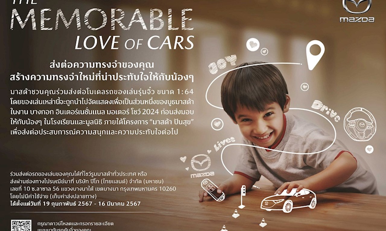 มาสด้าเชื่อว่าความสุขความสนุกสนานในวัยเด็กของหลายคนยังอยู่ในความทรงจำมาตลอด วันนี้ มาสด้าขอเชิญคนไทยหัวใจสปอร์ต มาร่วมกันส่งความสุขในวัยเด็กไปให้กับเยาวชน ในกิจกรรม “The Memorable Love of Cars” เสียสละรถโมเดลของเล่นเพื่อส่งต่อความทรงจำในวัยเด็กไปสร้างความทรงจำใหม่ให้เด็กที่ขาดโอกาส และรถโมเดลของเล่นที่เสียสละเข้ามาจะถูกนำไปจัดแสดงภายในบูธมาสด้าในงานมอเตอร์โชว์ เพื่อให้ผู้ชมงานได้รับชมและสัมผัสร่วมกัน ก่อนจะถูกส่งต่อให้กับน้อง ๆ เยาวชนในโรงเรียนหรือมูลนิธิฯ ที่มาสด้าจัดกิจกรรม “มาสด้า ปันสุข” เป็นกิจกรรมที่ริเริ่มขึ้นเพื่อแบ่งปันสิ่งดี ๆ กลับคืนสู่สังคมไทย ผู้ที่สนใจสามารถนำรถโมเดลของเล่นที่ไม่ได้เล่นแล้ว ทุกรุ่น ทุกยี่ห้อ (ขนาด 1:64) นำไปส่งที่โชว์รูมมาสด้าใกล้บ้านทั่วประเทศ หรือส่งทางไปรษณีย์ เริ่ม 19 กุมภาพันธ์ 2567 ถึง 16 มีนาคม 2567 ที่สำคัญมาสด้าจะเรียนเชิญผู้ที่ส่งรถเข้าร่วมกิจกรรมเดินทางเข้าชมบูธมาสด้า และรูปแบบการจัดแสดงรถโมเดลของเล่นก่อนใคร ในงาน มอเตอร์ โชว์ รอบวีไอพี วันที่ 25 มีนาคม 2567 ระหว่างเวลา 16:00 – 18:00 น.