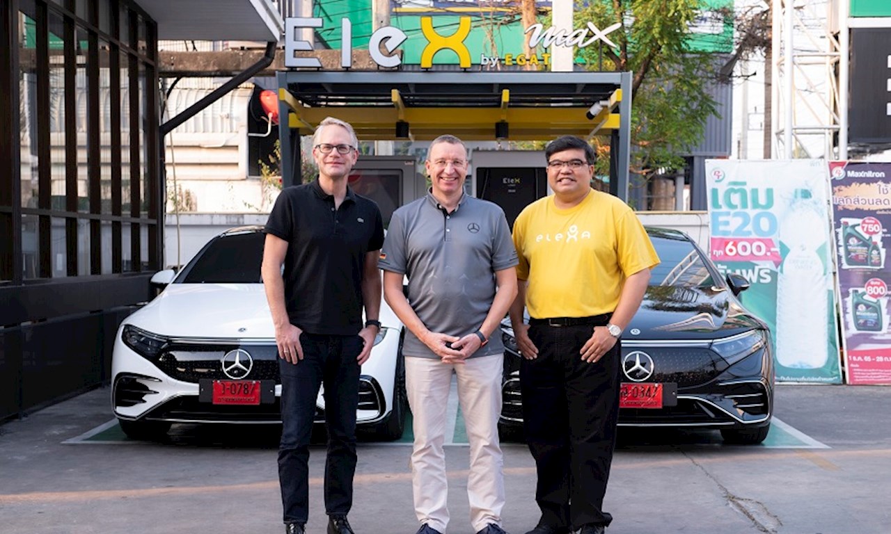 มร. มาร์ทิน ชเวงค์ ประธานบริหาร บริษัท เมอร์เซเดส-เบนซ์ (ประเทศไทย) จำกัด และ มร. บีเยิร์น กุซเทรา รองประธานบริหารฝ่ายขายและการตลาด บริษัท เมอร์เซเดส-เบนซ์ (ประเทศไทย) จำกัด พร้อมกับ นายวฤต รัตนชื่น ผู้ช่วยผู้ว่าการวิจัย นวัตกรรม และพัฒนาธุรกิจ ทำหน้าที่ Project Management Office การไฟฟ้าฝ่ายผลิตแห่งประเทศไทย (กฟผ.) ถ่ายภาพร่วมกันระหว่างทริปการทดสอบการขับขี่รถยนต์ไฟฟ้า 100% รุ่น EQS 500 4MATIC AMG Premium พร้อมเดินหน้าขับเคลื่อนประเทศสู่สังคมคาร์บอนต่ำอย่างยั่งยืน ณ สถานี EleX by EGAT เชียงใหม่ 8 ผ่านความร่วมมือของเมอร์เซเดส-เบนซ์ และ กฟผ. ในการส่งเสริมการใช้พลังงานสะอาด (Clean Energy) และสร้างความรู้ความเข้าใจให้คนไทยหันมาใช้รถยนต์พลังงานไฟฟ้า 100% ให้มากขึ้น เพื่อลดการปล่อยมลพิษออกสู่อากาศ มุ่งสู่เป้าหมายความเป็นกลางทางคาร์บอน (Carbon Neutrality) ร่วมกันในประเทศไทย ภายในปี ค.ศ. 2050