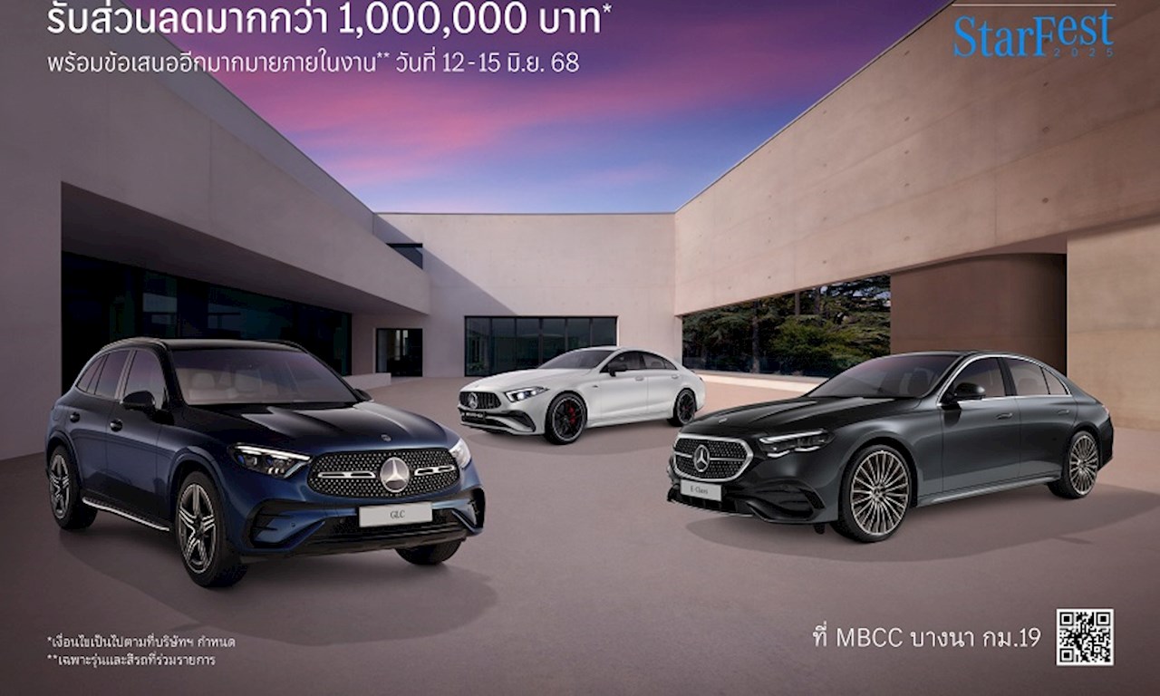 เมอร์เซเดส-เบนซ์ ประเทศไทย เดินหน้าเปิดประสบการณ์การเป็นเจ้าของยนตรกรรมระดับลักชัวรีผ่านแคมเปญส่งเสริมการขายรับกลางปี 2568 กับงาน Mercedes-Benz StarFest 2025 “The Hidden Season” เทศกาลที่รวมทุกข้อเสนอพิเศษจากเมอร์เซเดส-เบนซ์ หลากหลายรุ่น นำโดย GLC, CLS, E-Class และรถยนต์พลังงานไฟฟ้า 100% ในไลน์อัปของ EQS และ EQE ทั้งรุ่น Sedan, SUV, และรุ่นสมรรถนะสูงจาก Mercedes-AMG พร้อมข้อเสนอที่มอบความคุ้มค่าสูงสุดด้วยส่วนลดพิเศษมากกว่า 1,000,000 บาท* สำหรับลูกค้าที่เข้ามาที่งาน StarFest 2025 “The Hidden Season” ณ ศูนย์ MBCC ถนนบางนาตราด กม.19 ระหว่างวันที่ 12 - 15 มิถุนายน 2568 ตั้งแต่เวลา 10.00 น. – 20.00 น. และที่ตัวแทนจำหน่ายอย่างเป็นทางการ ที่เข้าร่วมแคมเปญ ระหว่างวันที่ 16 - 22 มิถุนายน 2568