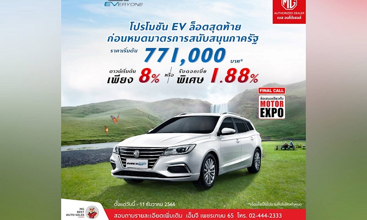 “เอ็มจี เบส ออโต้เซลล์” มุ่งมั่นรักษาแชมป์ยอดขายรถยนต์ไฟฟ้าเอ็มจี ครอง Market share 20% Retail Sales MG EVเร่งผลักดันยอดส่งมอบในไตรมาสสุดท้าย รับข้อเสนอ Motor Expo 2023 พร้อมอัดแคมเปญ EV ล็อตสุดท้าย ก่อนหมดเวลามาตรการรัฐสนับสนุน