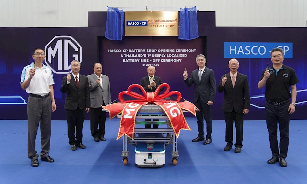 บริษัท เอสเอไอซี มอเตอร์-ซีพี จำกัด ได้เปิดโรงงานแบตเตอรี่อีวีแห่งใหม่ ภายใต้ชื่อ HASCO-CP BATTERY SHOP ในภูมิภาคอาเซียนบนพื้นที่ NEW ENERGY INDUSTRIAL PARK ครอบคลุมพื้นที่ทั้งหมดประมาณ 75 ไร่ หลังทำพิธีวางศิลาฤกษ์เมื่อช่วงเดือนเมษายนที่ผ่านมา โดยแบ่งพื้นที่เป็น 2 ส่วนใหญ่ ๆ ได้แก่ ส่วนการประกอบแบตเตอรี่ ประกอบด้วยสายการผลิตอัตโนมัติที่ทันสมัยอย่างการนำหุ่นยนต์ (Robotic) เข้ามาช่วยในการผลิตเพื่อให้ได้มาตรฐานที่แม่นยำ การเชื่อมโดยเลเซอร์ (Laser Welding) เพื่อให้ได้คุณภาพของการเชื่อมที่ดี การตรวจสอบด้วย CCD (Charge Coupled Device) เพื่อความแม่นยำในการตรวจสอบเทียบกับต้นแบบในทุกขั้นตอนก่อนนำไปใส่ในตัวรถยนต์พลังงานไฟฟ้า 100% และส่วนการทดสอบมาตรฐานของแบตเตอรี่ กว่า 60 ขั้นตอน อาทิ การตรวจสอบค่าการเก็บการคายประจุ (Charge & Discharge) การตรวจสอบน้ำรั่วซึมเข้าสู่แบตเตอรี่ (Air Leak test) ทดสอบความเป็นฉนวน (Insulation Test) ทดสอบการควบคุมพลังงาน (Static Test) เป็นต้น โดยในสายการผลิตแห่งนี้สามารถประกอบแบตเตอรี่ Cell-To-Pack ได้สูงสุดมากกว่า 50,000 ก้อนต่อปี ซึ่งแบตเตอรี่ที่ประกอบในประเทศไทยจะเป็นมาตรฐานเดียวกับสายการผลิตระดับโลก สำหรับแบตเตอรี่ที่ออกจากสายการผลิตนี้จะถูกนำไปติดตั้งในรถยนต์ไฟฟ้ารุ่น MG4 ELECTRIC เป็นรุ่นแรก รวมถึงรถไฟฟ้ารุ่นอื่น ๆ ในอนาคต ซึ่งอยู่ในระหว่างการเตรียมความพร้อมของสายการผลิตเพื่อเตรียมเปิดตัวอย่างเป็นทางการในปี พ.ศ. 2567