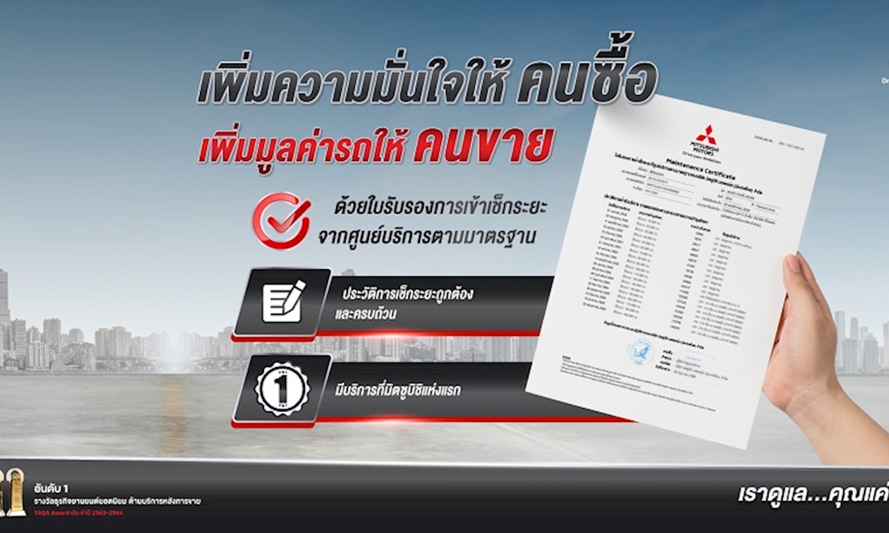 บริษัท มิตซูบิชิ มอเตอร์ส (ประเทศไทย) จำกัด เปิดตัวบริการ ‘ใบรับรองการเข้าศูนย์บริการมาตรฐานของบริษัท มิตซูบิชิ มอเตอร์ส (ประเทศไทย) จำกัด’ (Maintenance Certificate) ครั้งแรกในตลาดยานยนต์ไทย เพิ่มมูลค่าการขายต่อรถยนต์มิตซูบิชิ มอเตอร์ส และ ตอกย้ำถึงความมุ่งมั่นอย่างไม่หยุดยั้งในการสร้างความพึงพอใจสูงสุดให้แก่ลูกค้า และพัฒนาคุณภาพบริการด้านการขาย และบริการหลังการขาย ภายใต้แนวคิด ‘รถดี ดูแลดี ราคาขายต่อดี’