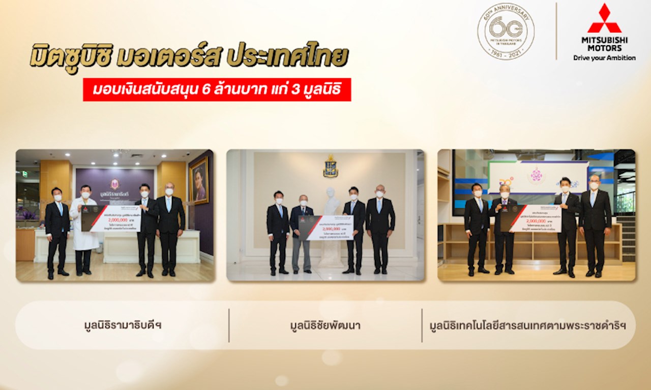 บริษัท มิตซูบิชิ มอเตอร์ส (ประเทศไทย) จำกัด นำโดย มร. เออิอิชิ โคอิโตะ กรรมการผู้จัดการใหญ่ พร้อมด้วย มร. ชิน คุโบะ กรรมการรองผู้จัดการใหญ่ สายงานกลยุทธ์องค์กร และ คุณสาโรจน์ มะอาจเลิศ ผู้ช่วยกรรมการผู้จัดการใหญ่อาวุโส สายงานขาย บริการหลังการขาย และการพัฒนาเครือข่ายผู้จัดจำหน่าย ร่วมส่งมอบเงินบริจาครวมมูลค่า 6 ล้านบาท ให้แก่ 3 มูลนิธิเพื่อสังคม มูลนิธิละ 2 ล้านบาท ได้แก่ มูลนิธิชัยพัฒนา มูลนิธิรามาธิบดีฯ และมูลนิธิเทคโนโลยีสารสนเทศตามพระราชดำริสมเด็จพระเทพรัตนราชสุดา ฯ สยามบรมราชกุมารี การบริจาคในครั้งนี้ เป็นส่วนหนึ่งของกิจกรรมฉลองครบรอบ 60 ปีในการดำเนินธุรกิจในประเทศไทย ซึ่งเกิดขึ้นตั้งแต่ปีที่ผ่านมา และเพื่อสานต่อความมุ่งมั่นในการพัฒนาสังคมไทยเพื่อการเติบโตอย่างยั่งยืน