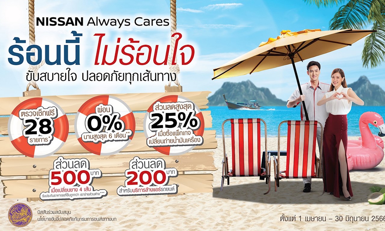 นิสสัน ประเทศไทย ส่งความห่วงใยต้อนรับเทศกาลสงกรานต์ มอบโปรโมชันพิเศษผ่านแคมเปญ “NISSAN ALWAYS CARES ร้อนนี้ ไม่ร้อนใจ ขับสบายใจ ปลอดภัยทุกเส้นทาง” ชวนลูกค้าเพิ่มความมั่นใจก่อนเดินทางไกลในช่วงเทศกาล ด้วยโปรโมชันตรวจเช็กสภาพรถยนต์ฟรี 28 รายการ พร้อมทั้งบริการล้างรถ ดูดฝุ่น ฉีดพ่นน้ำยาฆ่าเชื้อภายในรถยนต์ฟรี และส่วนลดพิเศษอื่น ๆ อีกมากมาย ตั้งแต่วันที่ 1 เมษายน – 30 มิถุนายน 2566