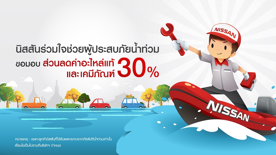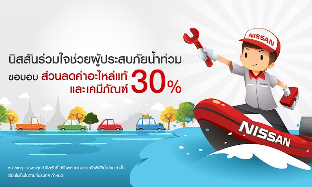 นิสสัน ประเทศไทย ร่วมใจช่วยผู้ประสบภัยน้ำท่วม พร้อมช่วยเหลือลูกค้านิสสันที่รถยนต์ได้รับความเสียหายจากน้ำท่วม ให้บริการรถลาก/รถยก จากบริเวณพื้นที่น้ำท่วมไปยังศูนย์บริการนิสสันที่ใกล้ที่สุดฟรี ถึง 30 กันยายน 2564 พร้อมมอบส่วนลด 30 % สำหรับค่าอะไหล่แท้, เคมีภัณฑ์, น้ำมันหล่อลื่น, ยาง และอุปกรณ์ตกแต่ง ตั้งแต่วันนี้ไปจนถึง 31 ธันวาคม 2564