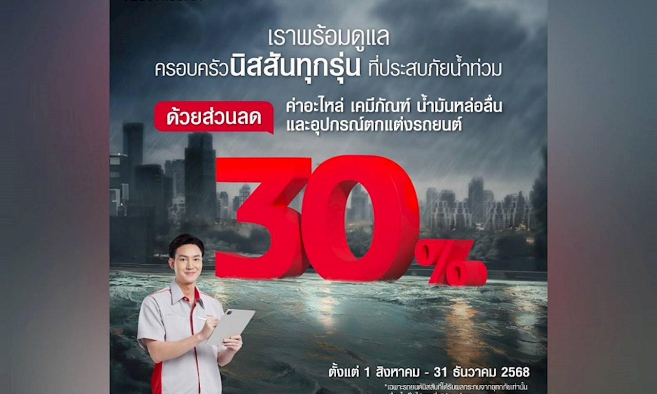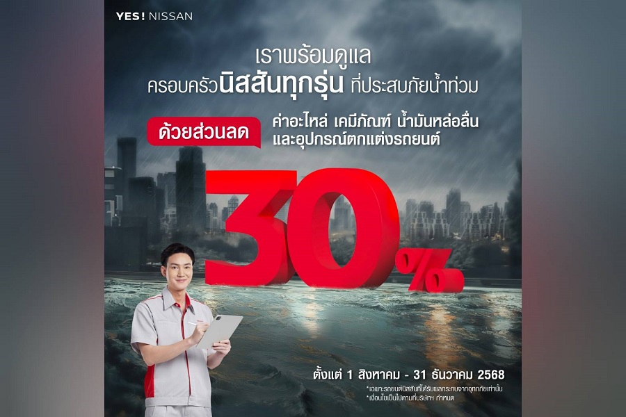 แคมเปญนี้จัดขึ้นเพื่อช่วยเหลือลูกค้านิสสันที่ได้รับความเสียหายจากน้ำท่วม และต้องรับผิดชอบค่าใช้จ่ายในการซ่อมแซมรถยนต์ด้วยตนเอง เนื่องจากความเสียหายดังกล่าวไม่อยู่ในความคุ้มครองของบริษัทประกันภัย โดยแคมเปญจะดำเนินตั้งแต่วันที่ 1 สิงหาคม ถึง 31 ธันวาคม 2568 ลูกค้าที่มีสิทธิ์จะได้รับส่วนลด 30% สำหรับอะไหล่ เคมีภัณฑ์ น้ำมันหล่อลื่น และอุปกรณ์ตกแต่งรถยนต์