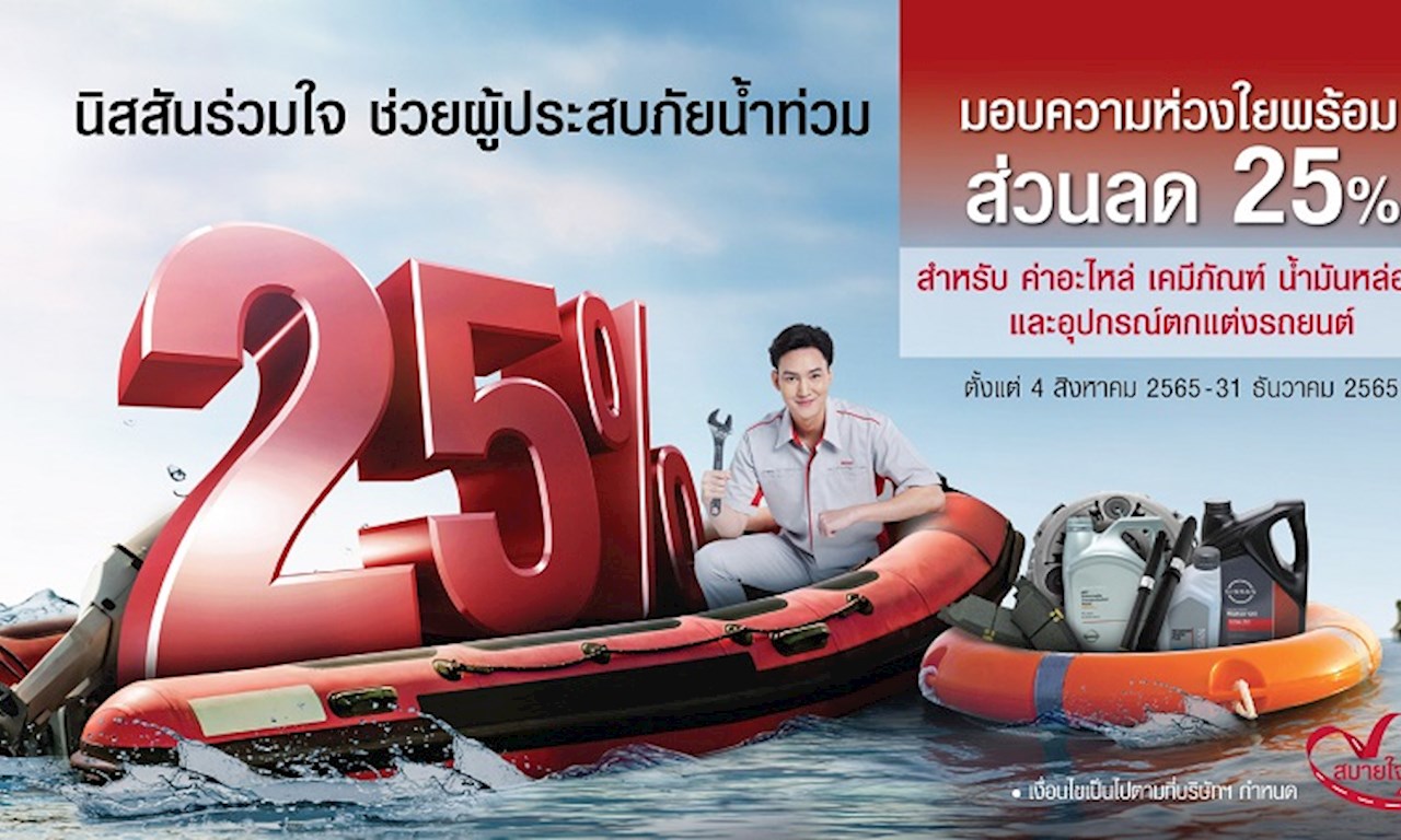 แคมเปญ “นิสสันร่วมใจช่วยผู้ประสบภัยน้ำท่วม” จะมอบส่วนลด 25% สำหรับค่าอะไหล่, เคมีภัณฑ์, น้ำมันหล่อลื่น และอุปกรณ์ตกแต่งรถยนต์ ในการดูแลซ่อมแซมรถยนต์นิสสันของลูกค้าที่ได้รับความเสียหายจากอุทกภัยที่กำลังเกิดขึ้นในหลาย ๆ พื้นที่ของประเทศ