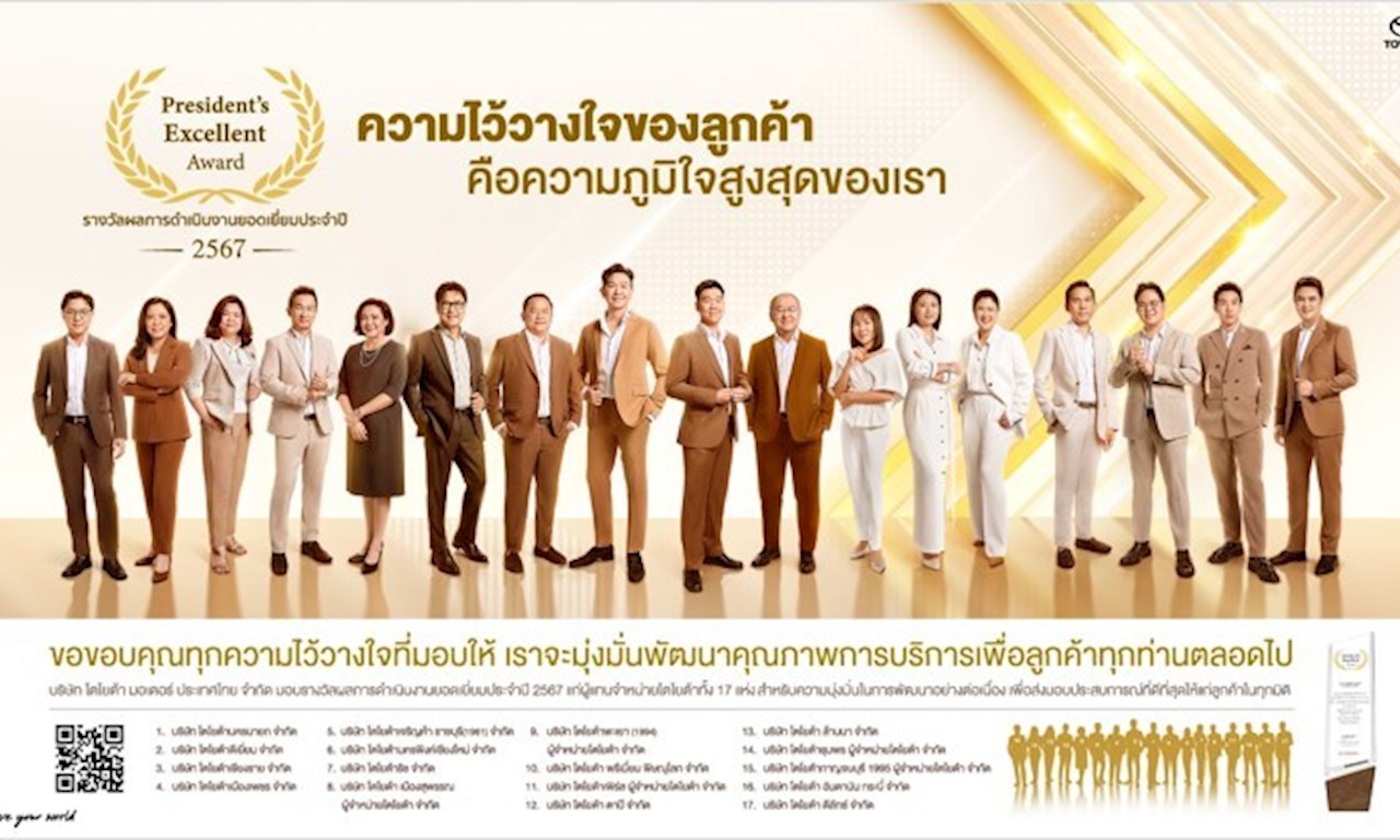 ทุก ๆ ปี โตโยต้าจะมอบรางวัลให้แก่ผู้แทนจำหน่ายฯ ที่มีผลงานอันโดดเด่น ผ่านการประเมินทั้งด้านยอดขาย บริการ และความพึงพอใจของลูกค้า โดยในปีนี้ ได้ถ่ายทอดบทสัมภาษณ์ผู้บริหาร 17 คน ที่ได้รับรางวัล 2024 President’s Excellent Award จากผลการดำเนินงานยอดเยี่ยมในปีที่ผ่านมา ที่ได้ส่งมอบสินค้าและบริการที่ได้มาตรฐาน จนกลายเป็นความเชื่อถือ ที่ลูกค้าให้ความไว้วางใจ และเลือกกลับมารับบริการอย่างต่อเนื่อง นำไปสู่การเป็นส่วนหนึ่งของครอบครัวโตโยต้า