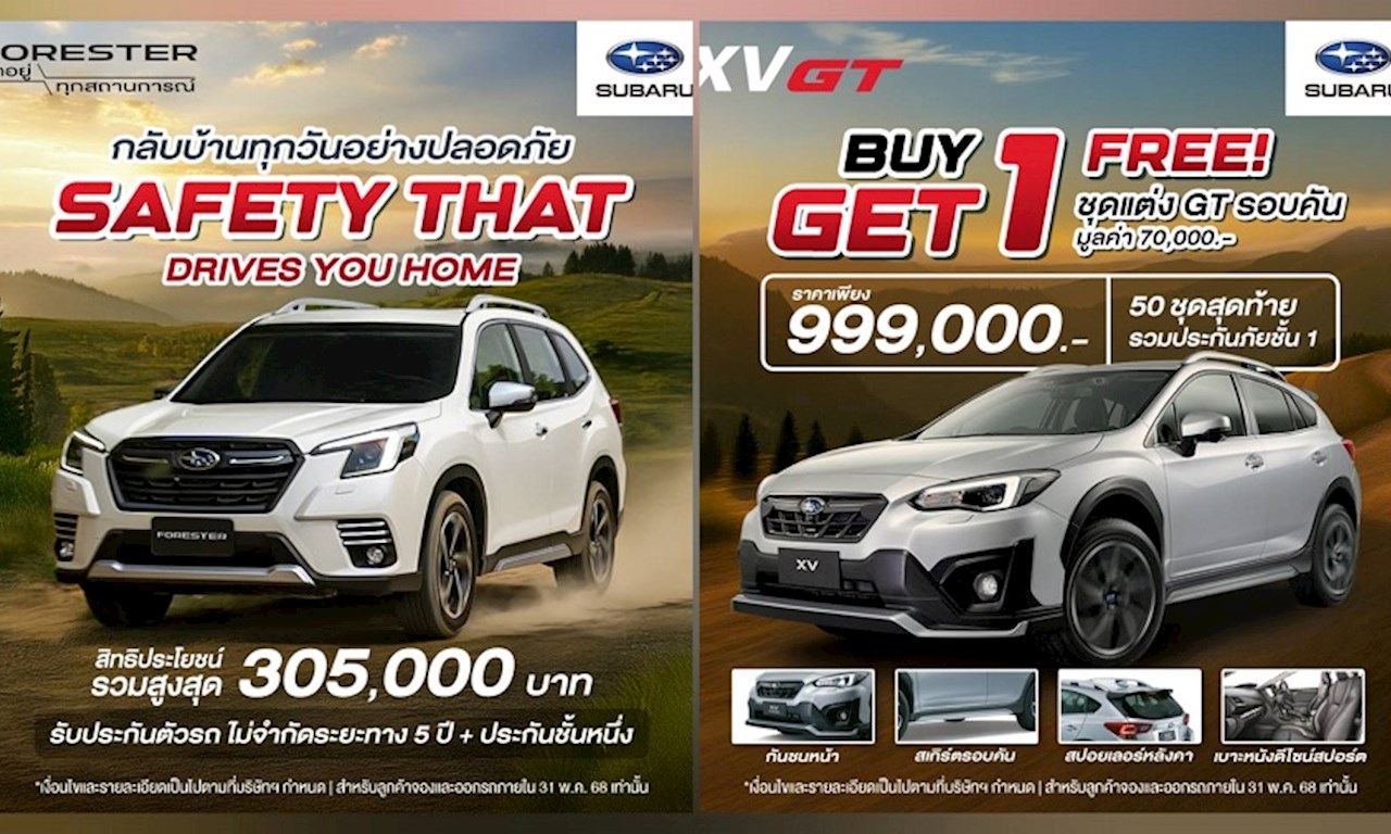 - ออก SUBARU XV EyeSight ด้วยแคมเปญ BUY 1 GET 1 FREE ในราคาเพียง 999,000 บาท รวมฟรีประกันภัยชั้นหนึ่ง และพิเศษชุดแต่ง GT สุดสปอร์ต