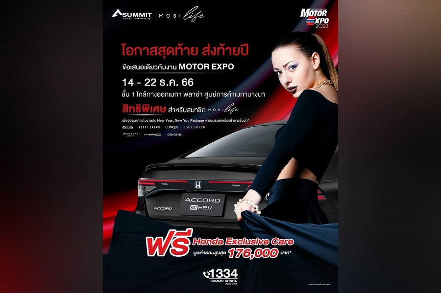 ซัมมิท ฮอนด้า ออโตโมบิล ผู้แทนจำหน่าย รถยนต์ ฮอนด้า อย่างเป็นทางการ ภายใต้บริษัท มิลเลนเนียม กรุ๊ป คอร์ปอเรชั่น (เอเชีย) จำกัด (มหาชน) หรือ MGC-ASIA จัดแสดง 2 ยนตรกรรมระดับพรีเมียม Honda Civic e:HEV เกรด EL+ และ All-New Honda Accord e:HEV เกรด RS พร้อมหยิบยื่นข้อเสนอพิเศษส่งท้ายปี ด้วยแคมเปญเดียวกับ มอเตอร์ เอ็กซ์โป 2023 ระหว่างวันที่ 14-22 ธันวาคม 2566 บริเวณชั้นหนึ่ง ใกล้ทางออกเมกาพลาซ่า ศูนย์การค้าเมกาบางนา หรือรับข้อเสนอสุดคุ้มค่าได้ที่โชว์รูม ซัมมิท ฮอนด้า ออโตโมบิล ทุกสาขา