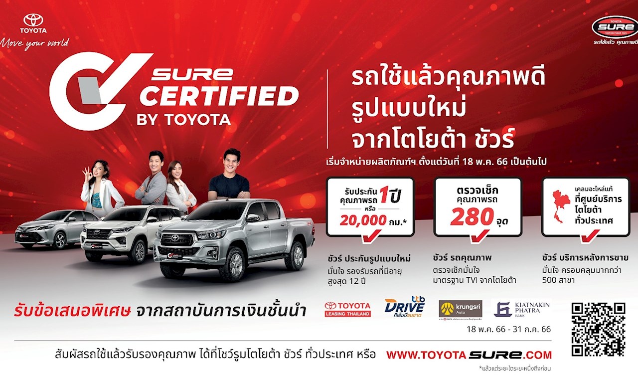 1. จำหน่ายรถยนต์ใช้แล้วพร้อมการรับประกันคุณภาพ “SURE CERTIFIED BY TOYOTA” มาตรฐานใหม่อีกระดับสำหรับรถยนต์ใช้แล้ว ที่ผ่านการรับรองคุณภาพโดย บริษัท โตโยต้า มอเตอร์ ประเทศไทย และสามารถเป็นเจ้าของได้ที่โชว์รูม โตโยต้า ชัวร์ โดยมาตรฐานการรับประกันจะแบ่งเป็น 3 ประเภท ด้วยคุณสมบัติ และสิทธิพิเศษต่าง ๆ ดังนี้