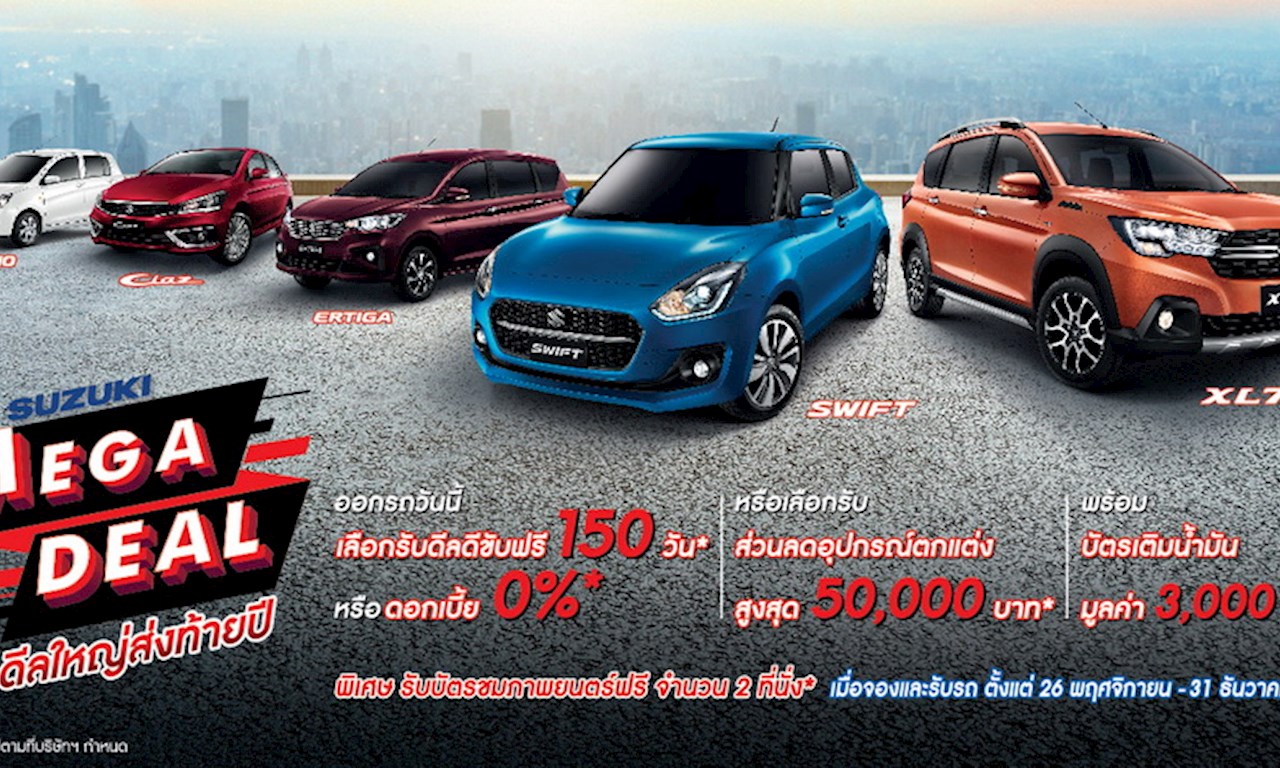แคมเปญ “SUZUKI MEGA DEAL ดีลยิ่งใหญ่ส่งท้ายปี” มอบให้สำหรับลูกค้าที่จองรถยนต์ซูซูกิทุกท่าน
