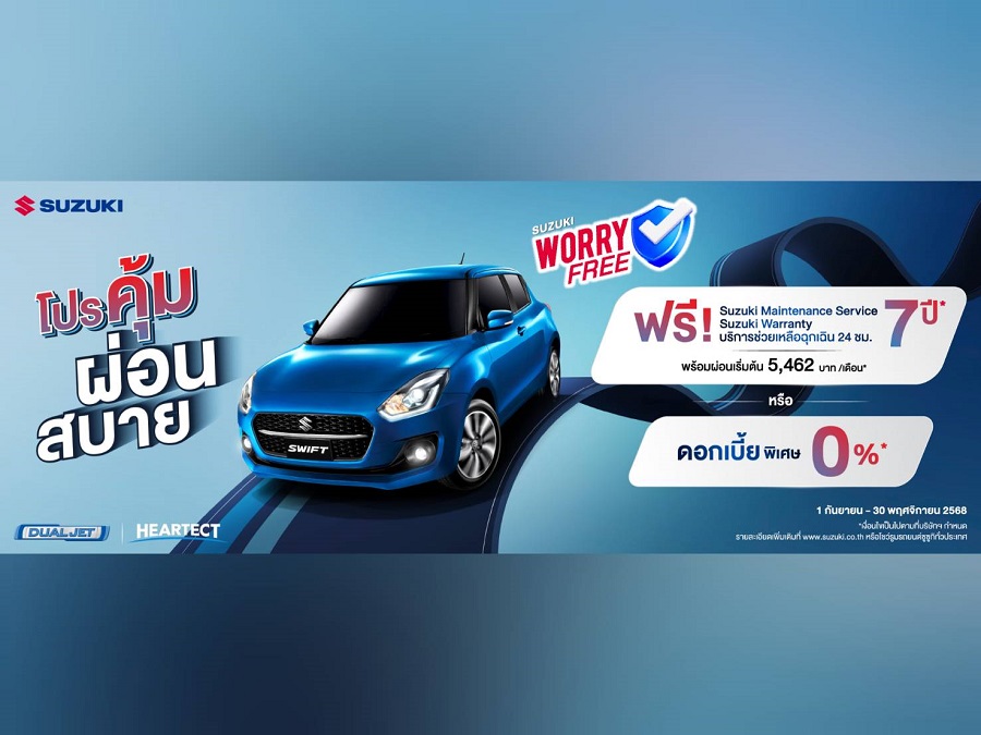บริษัท ซูซูกิ มอเตอร์ (ประเทศไทย) จำกัด เผย "SUZUKI WORRY FREE PROGRAM" สร้างปรากฏการณ์ใหม่ตลาดรถยนต์นั่งขนาดเล็ก ไม่ใช่เพียงแค่โปรโมชัน แต่คือการมอบความคุ้มค่าและความมั่นใจที่เหนือกว่าแก่ผู้บริโภคชาวไทย ส่งผลให้ SUZUKI SWIFT ยังครองใจและมียอดขายอย่างต่อเนื่องทั่วประเทศ ตอกย้ำความคุ้มค่า ด้วยข้อเสนอพิเศษ ผ่อนเริ่มต้นเพียง 5,462 บาท หรือ ดอกเบี้ย 0% ตั้งแต่วันนี้ถึง 30 พฤศจิกายน 2568