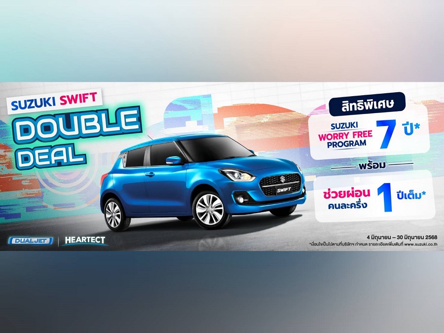 บริษัท ซูซูกิ มอเตอร์ (ประเทศไทย) จำกัด ชวนคุณมาเป็นเจ้าของ SUZUKI SWIFT สปอร์ตแฮทช์แบ็กอีโคคาร์รุ่นยอดนิยม พร้อมร่วมสัมผัสประสบการณ์แห่งความคุ้มค่า ด้วยแคมเปญสุดเร้าใจ "SUZUKI SWIFT DOUBLE DEAL" ตลอดเดือนมิถุนายน-สิงหาคม 2568 ที่จะทำให้การเป็นเจ้าของ SUZUKI SWIFT เป็นเรื่องง่ายและสบายใจยิ่งกว่าเคยSUZUKI SWIFT ยังคงเป็นตัวเลือกอันดับต้น ๆ สำหรับผู้ที่มองหารถยนต์ที่ครบครัน ทั้งด้านดีไซน์ที่โฉบเฉี่ยว ทันสมัย ประหยัดน้ำมันเป็นเลิศ และสมรรถนะการขับขี่ที่สนุกสนาน ตอบโจทย์การใช้งานในเมืองและเดินทางไกลได้อย่างลงตัว ด้วยความมุ่งมั่นที่จะส่งมอบความคุ้มค่าสูงสุดให้แก่ลูกค้า ซูซูกิจึงจัดเต็มด้วยข้อเสนอที่พลาดไม่ได้ แคมเปญ "SUZUKI SWIFT DOUBLE DEAL" มาพร้อมความคุ้มค่าที่มอบให้คุณมากกว่าใคร ดังนี้