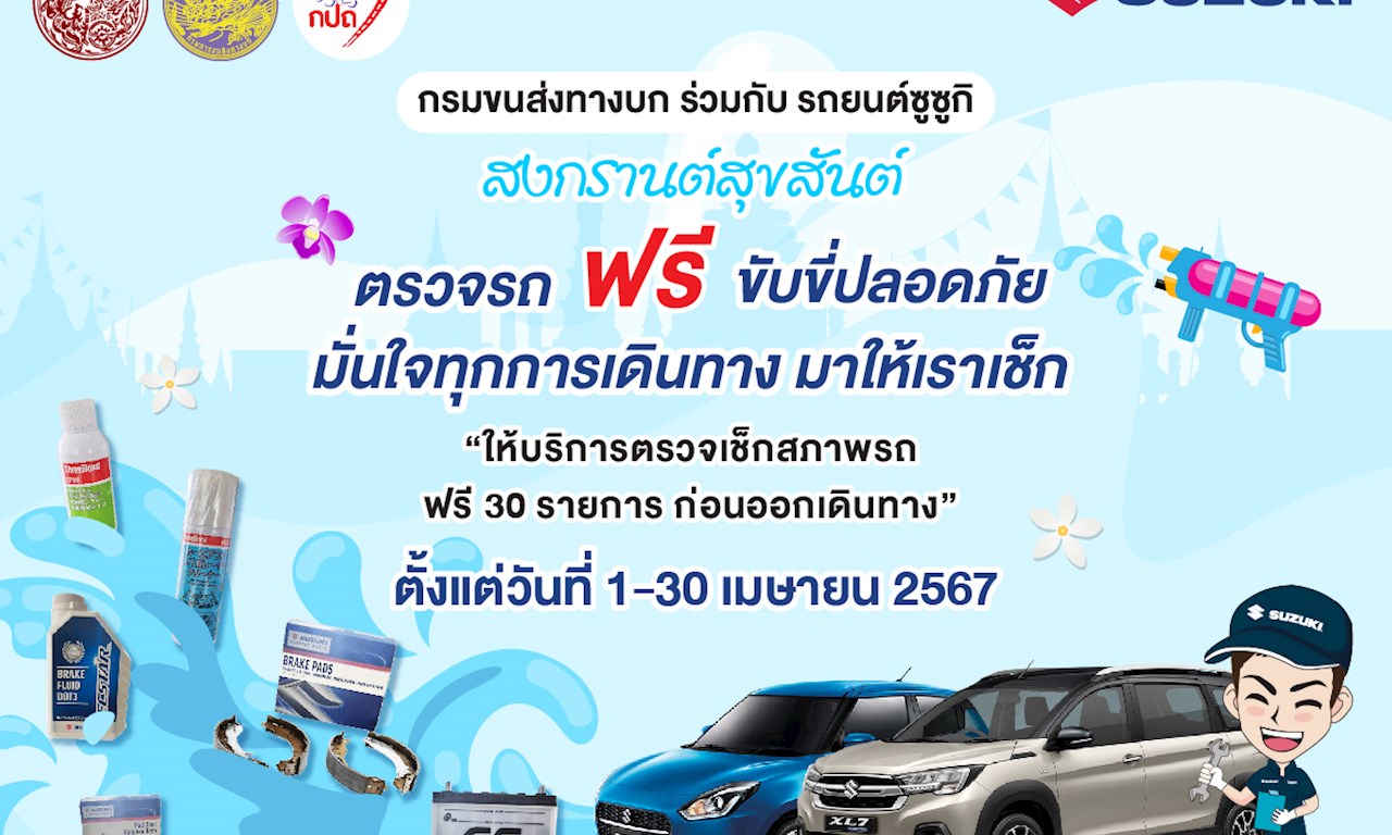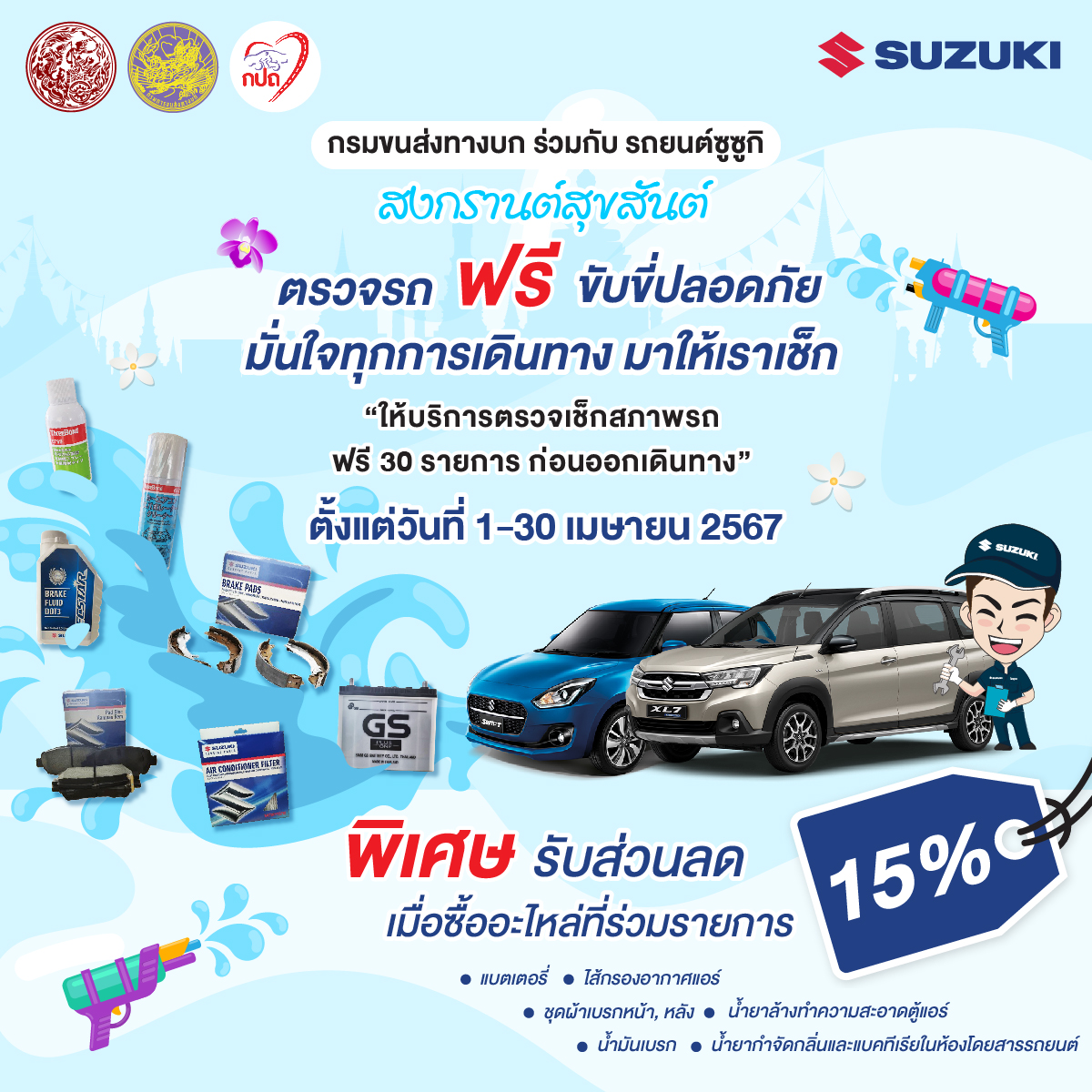 บริษัท ซูซูกิ มอเตอร์ (ประเทศไทย) จำกัด ร่วมกับกรมการขนส่งทางบก จัดแคมเปญส่งความสุข “สงกรานต์ปลอดภัย ตรวจสภาพรถฟรี ขับขี่อุ่นใจ” เชิญชวนลูกค้ารถยนต์ซูซูกิทุกท่าน เข้ารับบริการตรวจสภาพรถยนต์ฟรี 30 รายการ พร้อมมอบข้อเสนอพิเศษสุด ลูกค้าเปลี่ยนอะไหล่ที่เข้าร่วมรายการได้รับส่วนลดสูงสุด 15% ตั้งแต่วันที่ 1-30 เมษายน 2567 ที่ศูนย์บริการรถยนต์ซูซูกิทั่วประเทศ
