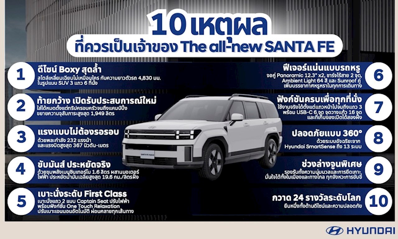 บริษัท ฮุนได โมบิลิตี้ (ประเทศไทย) จำกัด สร้างปรากฏการณ์เขย่าตลาด SUV ไทย ด้วยการส่ง The all-new SANTA FE ยนตรกรรม SUV ไฮบริดระดับเรือธง 3 แถว 6 ที่นั่ง ที่รวมทุกความต้องการไว้ในคันเดียวอย่างไร้ข้อจำกัด ไม่ว่าจะเป็นดีไซน์ทรงเหลี่ยมแบบ Boxy สุดล้ำ ภายในห้องโดยสารหรูหรา พื้นที่เก็บสัมภาระท้ายที่กว้างขวาง พร้อมขยายพื้นที่เพื่อเปิดรับประสบการณ์ใหม่ ๆ มาพร้อมฟังก์ชันล้ำสมัย ความปลอดภัยครบครัน และสมรรถนะเหนือระดับ สมรรถนะทรงพลัง เทคโนโลยีจัดเต็ม และความคุ้มค่าแบบที่ “ให้เกินราคา” พร้อมเผยอินไซต์ 10 เหตุผลเด็ด! ที่ทำให้ The all-new SANTA FE กลายเป็นตัวเลือกที่ต้องมีในลิสต์ของผู้บริโภคยุคใหม่ ตอกย้ำสโลแกน “Open for More Horizons” มากกว่าเส้นขอบฟ้า คือ คำว่าอิสระ ให้ The all-new SANTA FE เป็นส่วนหนึ่งในการเปิดประสบการณ์ใหม่ ๆ ไร้ขีดจำกัดสำหรับคุณ