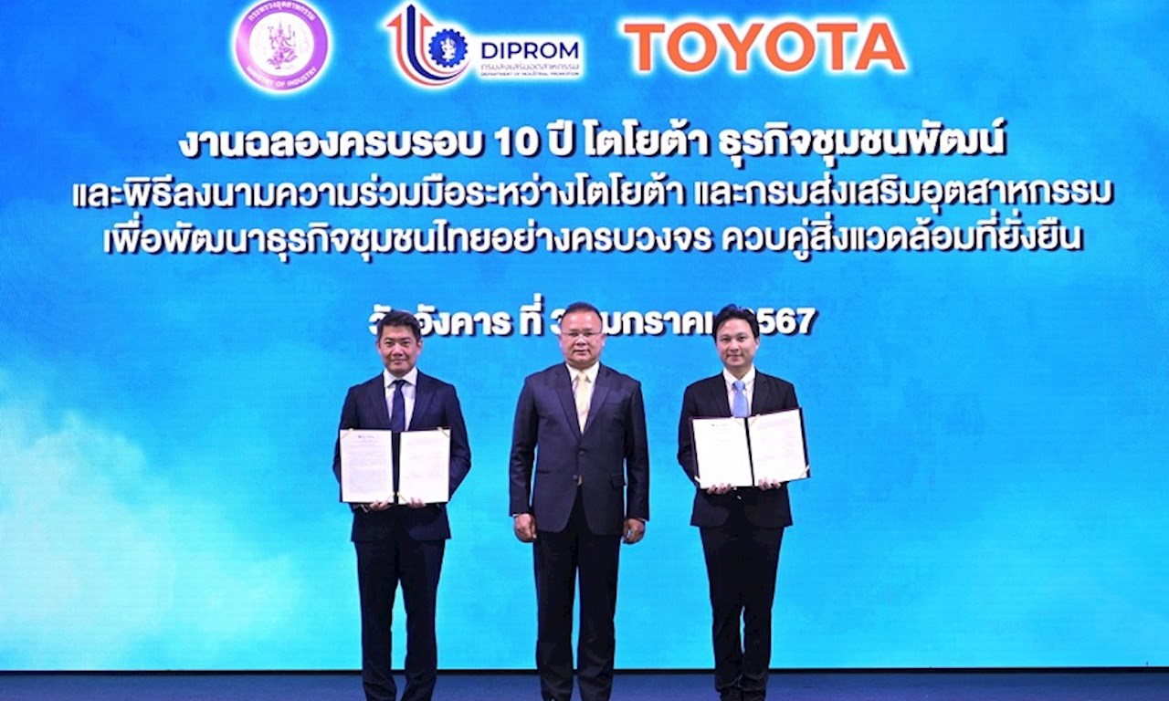 นายบรรจง สุกรีฑา รองปลัดกระทรวงอุตสาหกรรม นายภาสกร ชัยรัตน์ อธิบดีกรมส่งเสริมอุตสาหกรรม นายนันทวัฒน์ ศรีวรัตน์อัชกุล ผู้ช่วยกรรมการผู้จัดการใหญ่ บริษัท โตโยต้า มอเตอร์ ประเทศไทย จำกัด พร้อมด้วยคณะเจ้าหน้าที่จากกรมส่งเสริมอุตสาหกรรม และคณะผู้บริหารระดับสูง บริษัท โตโยต้า มอเตอร์ ประเทศไทย จำกัด ร่วมเป็นเกียรติภายในงานฉลองความสำเร็จครบรอบ 10 ปี โครงการโตโยต้าธุรกิจชุมชนพัฒน์ และพิธีลงนามบันทึกข้อตกลงความร่วมมือกับกรมส่งเสริมอุตสาหกรรม กระทรวงอุตสาหกรรม เพื่อยกระดับ การพัฒนาธุรกิจชุมชนไทยอย่างครบวงจร ควบคู่สิ่งแวดล้อมที่ยั่งยืน ณ TOYOTA ALIVE เมื่อวันอังคารที่ 30 มกราคม 2567 ที่ผ่านมา