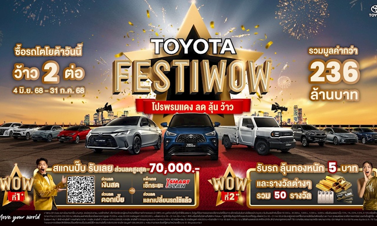 โตโยต้าเสิร์ฟโปรโมชันเด็ดช่วงกลางปี "โตโยต้า เฟสติว้าว (FESTIWOW) โปรพรมแดง ลด ลุ้น ว้าวว" กับข้อเสนอพิเศษที่จะทำให้ว้าว 2 ต่อ กับ ว้าวที่ 1 กับหลายทางเลือก เพื่อให้เลือกรับหนึ่งสิทธิ์สุดว้าว ตามใจลูกค้า ทั้งส่วนลดเงินสด หรือเลือกรับส่วนลดดอกเบี้ย เมื่อซื้อรถใหม่ หรือจะเลือกแพ็กเกจเช็กระยะ ที่สร้างความมั่นใจให้ลูกค้าขั้นสุด รวมทั้งยังมีส่วนลดแลกเปลี่ยนรถใช้แล้ว สำหรับซื้อรถยนต์คันใหม่เมื่อนำรถยนต์คันเก่ามาขาย ว้าวที่ 2 เมื่อรับรถแล้ว ยังได้ลุ้นต่อกับ ลุ้นทองคำหนัก 5 บาท และรางวัลอื่น ๆ อีกมากมาย โปรโมชันดีๆแบบนี้ เสิร์ฟพิเศษสำหรับลูกค้าที่จองและออกรถยนต์โตโยต้าทุกรุ่นตั้งแต่วันที่ 4 มิถุนายน - 31 กรกฎาคม 2568 ณ โชว์รูมโตโยต้าทั่วประเทศ