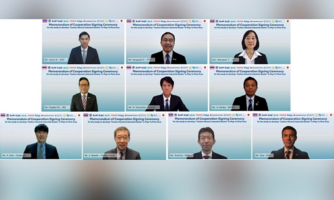 พันธมิตรองค์กรภาครัฐและเอกชนของประเทศไทยและประเทศญี่ปุ่น ได้จัดพิธีลงนามบันทึกข้อตกลงความร่วมมือการศึกษาเพื่อพัฒนา “นิคมอุตสาหกรรมที่มุ่งสู่ความเป็นกลางทางคาร์บอน” อันประกอบด้วยกลุ่มองค์กรพันธมิตรที่ร่วมลงนามในพิธีการที่จัดผ่านทางออนไลน์ ได้แก่ การนิคมอุตสาหกรรมแห่งประเทศไทย (กนอ.) , บริษัท บางกอกอินดัสเทรียลแก๊ส จำกัด , บริษัท โอซาก้า แก๊ส (ประเทศไทย) จำกัด , บริษัท ปตท. จำกัด (มหาชน) , บริษัท พีทีที โกลบอล เคมิคอล จำกัด (มหาชน) , บริษัท คันไซ อิเลกทริค เพาเวอร์ จำกัด , บริษัท โตโยต้า มอเตอร์ ประเทศไทย จำกัด และ บริษัท โตโยต้า ทูโช (ไทยแลนด์) จำกัด โดยมี ประธานกรรมการของการนิคมอุตสาหกรรมแห่งประเทศไทย และหน่วยงานด้านทรัพยากรธรรมชาติและพลังงานในสังกัดกระทรวงเศรษฐกิจ การค้า และอุตสาหกรรม ของประเทศญี่ปุ่น เข้าร่วมเป็นสักขีพยานภายในงาน นอกจากนี้ ยังได้รับเกียรติจาก มร.นาชิดะ คาสุยะ เอกอัครราชทูตวิสามัญผู้มีอำนาจเต็มแห่งญี่ปุ่นประจำราชอาณาจักรไทย ร่วมแสดงความยินดีกับผู้เข้าร่วมในพิธีลงนามบันทึกข้อตกลงความร่วมมือดังกล่าว เมื่อวันที่ 10 พฤศจิกายน 2564