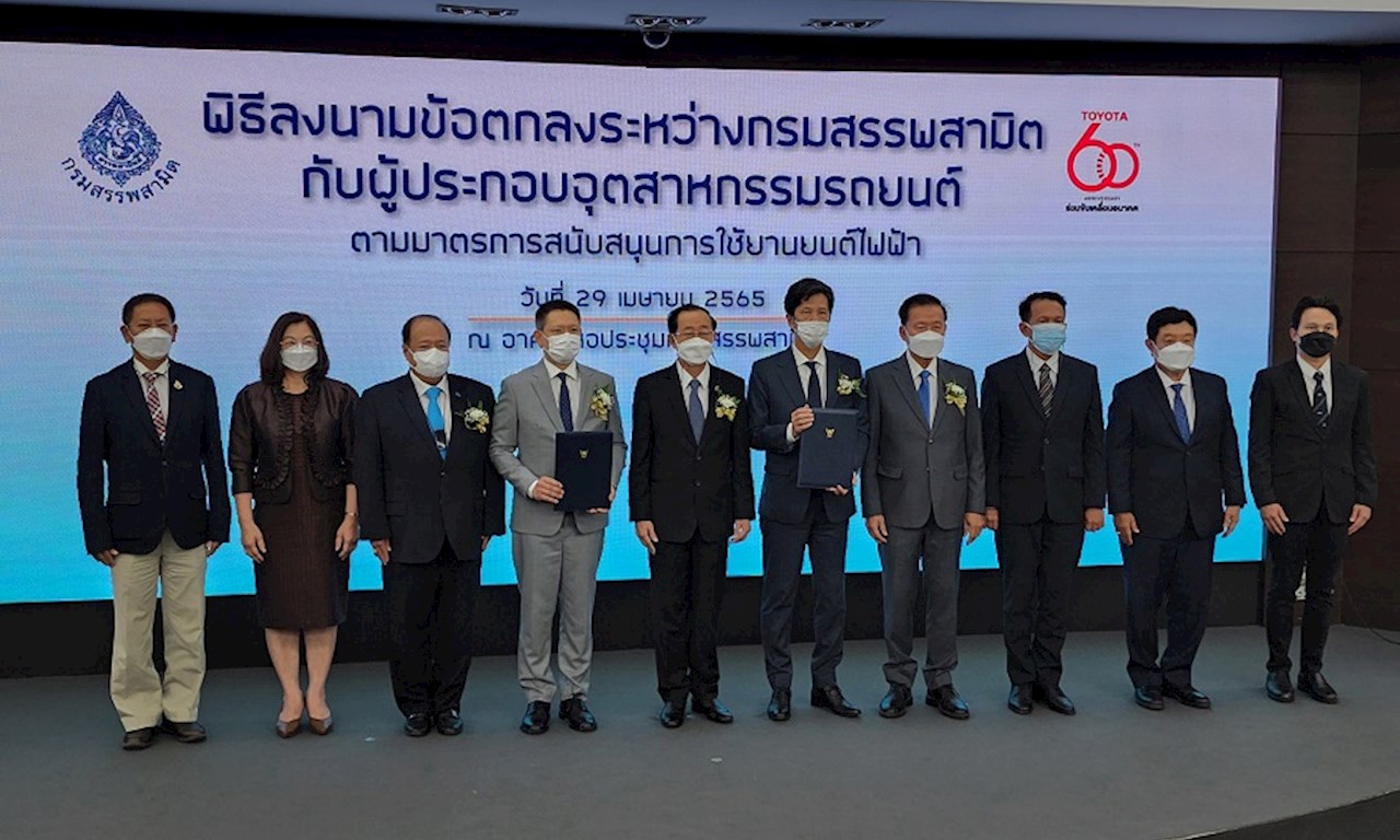 มร. โนริอากิ ยามาชิตะ กรรมการผู้จัดการใหญ่ บริษัท โตโยต้า มอเตอร์ ประเทศไทย จำกัด นายนินนาท ไชยธีรภิญโญ ประธานคณะกรรมการ บริษัท โตโยต้า มอเตอร์ ประเทศไทย จำกัด พร้อมด้วยคณะผู้บริหารระดับสูงขององค์กร เข้าเป็นตัวแทนใน “พิธีลงนามข้อตกลงระหว่างกรมสรรพสามิตกับผู้ประกอบอุตสาหกรรมรถยนต์” เพื่อตอกย้ำความมุ่งมั่นขององค์กรในการส่งเสริมการใช้ยานยนต์ไฟฟ้า สอดคล้องกับมาตรการสนับสนุนการใช้ยานยนต์ไฟฟ้าของ คณะกรรมการนโยบายยานยนต์ไฟฟ้าแห่งชาติ โดยมีนายอาคม เติมพิทยาไพสิฐ รัฐมนตรีว่าการกระทรวงการคลัง นายลวรณ แสงสนิท อธิบดีกรมสรรพสามิต นายณัฐกร อุเทนสุต ที่ปรึกษาด้านพัฒนาระบบควบคุมทางสรรพสามิต นายเกรียงไกร พัฒนาภรณ์ ผู้อำนวยการสำนักมาตรฐานและพัฒนาการจัดเก็บภาษี 2 ร่วมลงนามและเป็นสักขีพยาน ในวันศุกร์ที่ 29 เมษายน 2565 ณ อาคารหอประชุม กรมสรรพสามิต