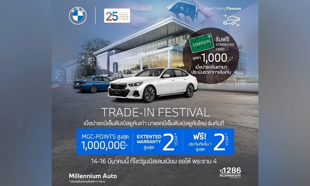 มาสเตอร์ เซอร์ทิฟายด์ ยูสคาร์ ศูนย์รวมรถยนต์มือสองครบวงจร ภายใต้บริษัท มิลเลนเนียม กรุ๊ป คอร์ปอเรชั่น (เอเชีย) จำกัด (มหาชน) ร่วมมือกับ มิลเลนเนียม ออโต้ กรุ๊ป ขอเชิญผู้ที่กำลังสนใจยนตรกรรม บีเอ็มดับเบิลยู นำรถยนต์คันเดิม มาเปลี่ยนเป็น บีเอ็มดับเบิลยู คันใหม่ พร้อมรับ MGC POINT สูงสุด 1,000,000 คะแนน ภายในงาน ‘TRADE-IN FESTIVAL’ ระหว่างวันที่ 14-16 มีนาคมนี้ ที่โชว์รูม บีเอ็มดับเบิลยู มิลเลนเนียม ออโต้ พระราม 4 และ โชว์รูม บีเอ็มดับเบิลยู มิลเลนเนียม ออโต้ ชั้น 3 ศูนย์การค้าไอคอนสยาม