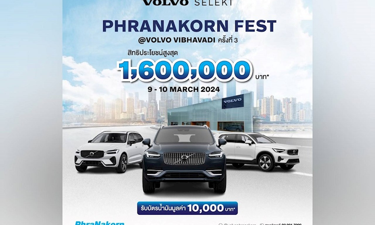 บริษัท พระนคร สวีดิช คาร์ จำกัด หนึ่งในผู้แทนจำหน่ายรถยนต์วอลโว่อย่างเป็นทางการในประเทศไทย ผู้ให้บริการครบคลุม ทั้งงานขาย และงานให้บริการหลังการขาย แบบ One Stop Service จัดงานมหกรรมสุดพิเศษตั้งแต่ต้นปี Volvo Phranakorn Fest 2024 ครั้งที่ 3 ซึ่งเป็นผลต่อเนื่องจากกระแสการตอบรับที่ดีของการจัดงานก่อนหน้านี้ โดยงานครั้งนี้ได้นำรถยนต์วอลโว่ผู้บริหารป้ายแดง เลขไมล์น้อย ที่ได้รับการการันตีคุณภาพกว่า 50 คัน ยกขบวนมาให้เลือกซื้อแบบได้สัมผัสคันจริงกันในงาน พร้อมด้วยสิทธิพิเศษสูงสุดถึง 1,600,000 บาท สำหรับงาน Volvo Phranakorn Fest 2024 ครั้งที่ 3 จัดขึ้นเพียงแค่ 2 วันเท่านั้น วันเสาร์ที่ 9 มีนาคม ถึงวันอาทิตย์ที่ 10 มีนาคม 2567 ที่โชว์รูม และลานกิจกรรม วอลโว่ พระนคร สำนักงานใหญ่ ถนนวิภาวดี