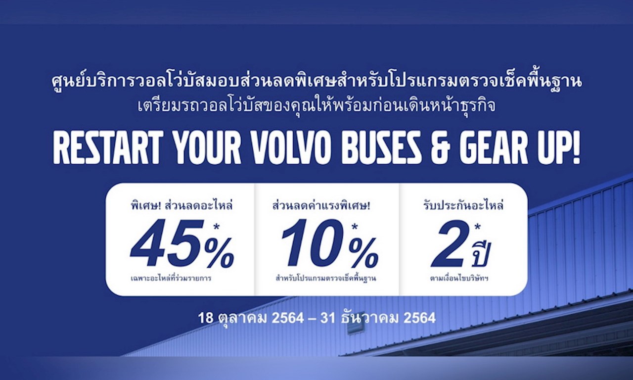 บริษัท วอลโว่ บัส (ประเทศไทย) จำกัด ซึ่งเป็นผลิตและจัดจำหน่ายรถบัสสายพันธุ์สวีเดน วอลโว่ บัส อย่างเป็นทางการในประเทศไทย เชิญชวนลูกค้านำรถวอลโว่ บัส เข้ารับการตรวจเช็คใหญ่เพื่อรับกับนโยบายการเปิดประเทศต้อนรับนักท่องเที่ยวของรัฐบาล โดยจัดโปรโมชันพิเศษสำหรับการเข้าเช็คใหญ่ ภายใต้แคมเปญ “Restart Your Volvo Buses and Gear Up” โดยลดค่าอะไหล่ที่ร่วมรายการ 45%