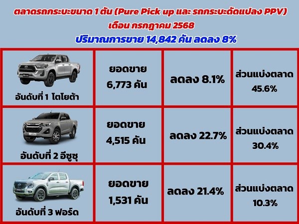ยอดรถรถยนต์เดือนกรกฎาคมที่ผ่านมา แม้ว่ารถยนต์จะมีอัตราการเติบโตที่เพิ่มขึ้น 5.8% เมื่อเทียบกับช่วงเดียวกันของปี 2567 ในส่วนกลุ่มรถยนต์นั่งปรับตัวเพิ่มขึ้น 13.3% ยอดประมาณ 18,760 คัน รถยนต์เพื่อการพาณิชย์ปรับเพิ่มขึ้น 1.7% คิดเป็นยอดประมาณ 11,114 คัน แต่รถกระบะขนาด 1 ตัน คือรถเพื่อการใช้งานกลับมียอดลดลง 8% หากวิเคราะห์จากมาตรการรัฐบาลที่มีโครงการช่วยเหลือ “กระบะพี่ มีคลังค้ำ” ฟรี!