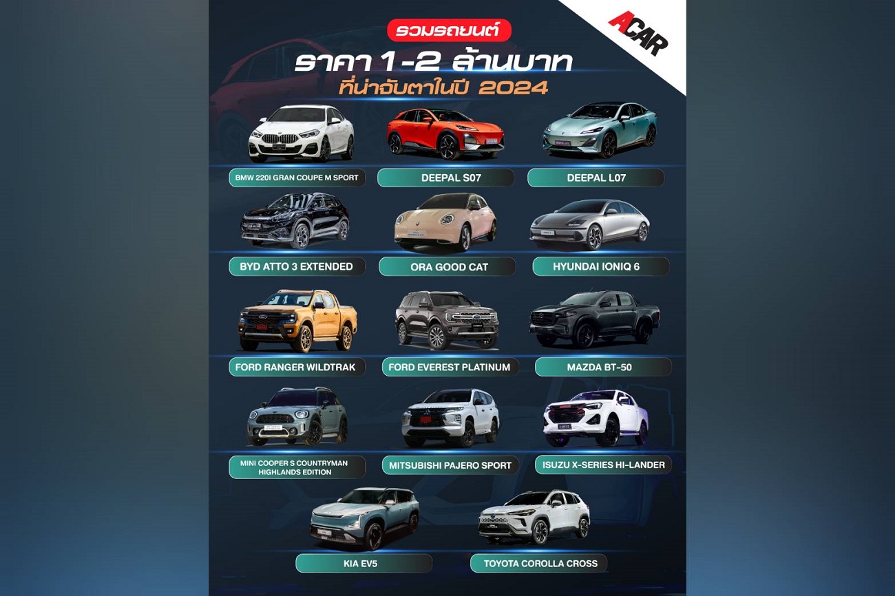 เปิดกันที่ค่ายพี่เบิ้ม-โตโยต้าที่ครองยอดจองสูงสุด ในงานบางกอกอินเตอร์เนชั่นแนล มอเตอร์โชว์ 2024 ด้วยจำนวน  8,540 คัน ค่ายนี้ได้รับการตอบรับจากผู้บริโภค เพราะมีรถยนต์เครื่องยนต์สันดาป รถพลังงานทางเลือกหลากหลายรุ่น กระแสความนิยมจึงไปตกที่เจ้าตลาด อย่างโตโยต้า ที่มีรถรุ่นใหม่ที่น่าสนใจ วันนี้จะขอหยิบยกรถยนต์ในระดับราคา 1-2 ล้านบาท มานำเสนอ...